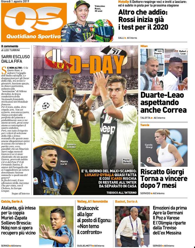 TORINO – Ecco che vi proponiamo l’apertura in prima pagina del Quotidiano Sportivo disponibile in tutte le edicole di oggi 01/08/2019. In apertura la questione relativa al D-DAY che sembra arrivare per vedersi concretizzare lo scambio Lukaku in Italia e Paulo Dybala in Inghilterra, sponda Manchester United.