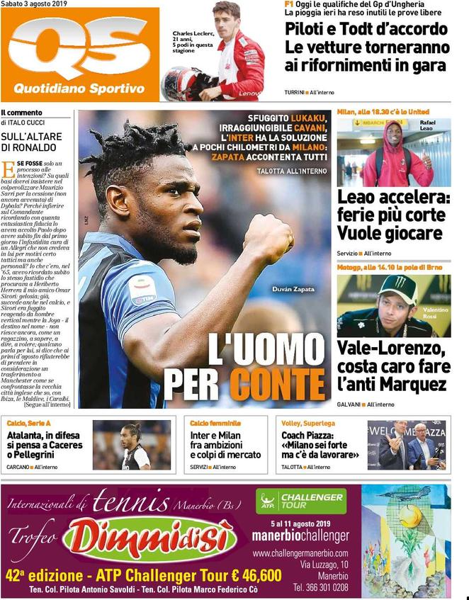 TORINO – Ecco che vi proponiamo l’apertura in prima pagina del Quotidiano Sportivo disponibile in tutte le edicole di oggi 03/08/2019. In apertura la questione relativa al mercato dell’Inter, con Duvan Zapata che potrebbe diventare il nuovo attaccante dell’Inter. In alto la F1, con il possibile ritorno ai rifornimenti in gara.