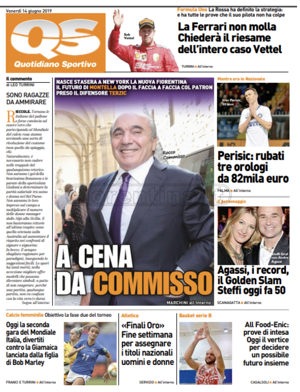 TORINO – Ecco che vi proponiamo l’apertura in prima pagina del Quotidiano Sportivo. In apertura la questione relativa a Commisso e al primo colpo del neo presidente della Fiorentina, che succede ai Della Valle. Preso Terzic e siglata poi la conferma a Montella. In alto la Ferrari che non molla e affronta in tribunale la FIA.