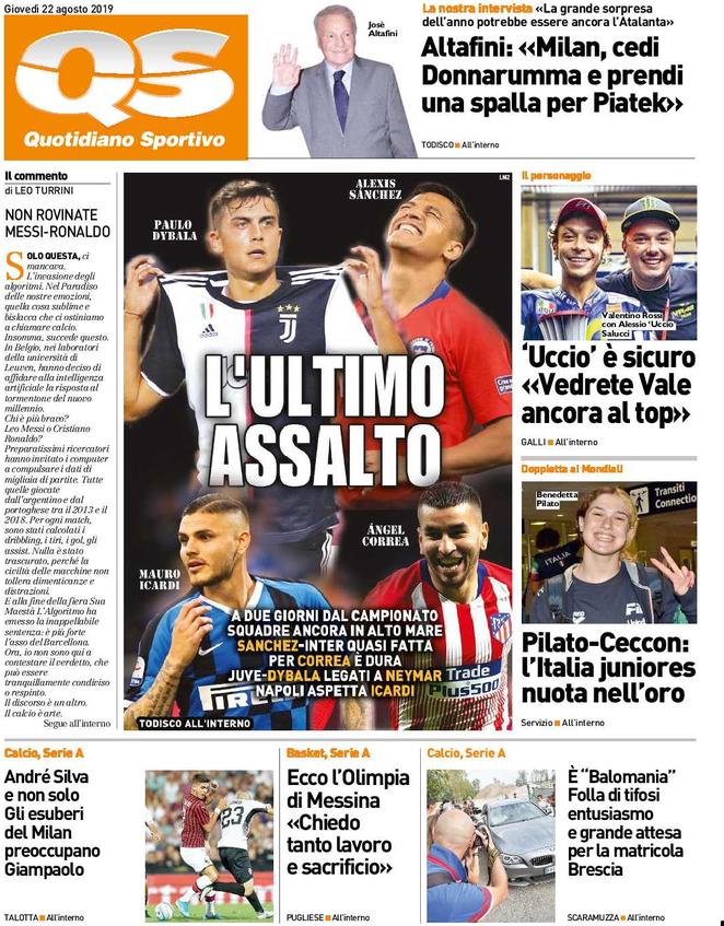 TORINO – Ecco che vi proponiamo l’apertura in prima pagina del Quotidiano Sportivo disponibile in tutte le edicole di oggi 22/08/2019.