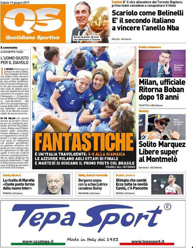 TORINO – Ecco che vi proponiamo l’apertura in prima pagina del Quotidiano Sportivo. In apertura la questione relativa al mondiale femminile, con la vittoria dell’Italia per 5-0 contro la Giamaica. Poi il Milan di Boban, che torna in rossonero dopo ormai 18 anni ed il solito super Marquez nelle libere di Montmelò.