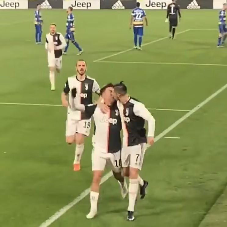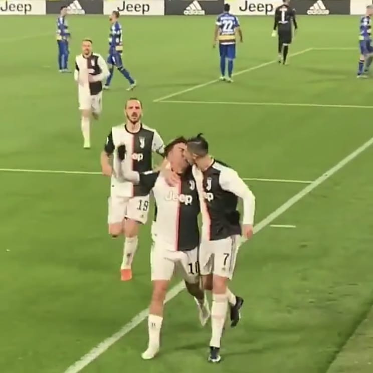 TORINO – La Juventus si è imposta per 2-1 ieri sera grazie alla doppietta di Cristiano Ronaldo. Il portoghese ha segnato per la settimana partita consecutiva, assistito nel secondo gol da Paulo Dybala: nel momento del l’esultanza il portoghese ha cercato proprio il numero 10 per esultarci insieme, e mentre i due festeggiavano abbracciati si sono scambiati un bacio fortuito che è stato ripreso da un tifoso dalle tribune. Il video è diventato subito virale tra i tifosi che hanno celebrato l’intesa tra i due. Ma attenzione perché, proprio in queste ultime ore, Gianluca Di Marzio ha dato un clamoroso annuncio di mercato in diretta TV su Sky: svelato il possibile botto della Juve degli ultimi giorni! >>>VAI ALLA NOTIZIA