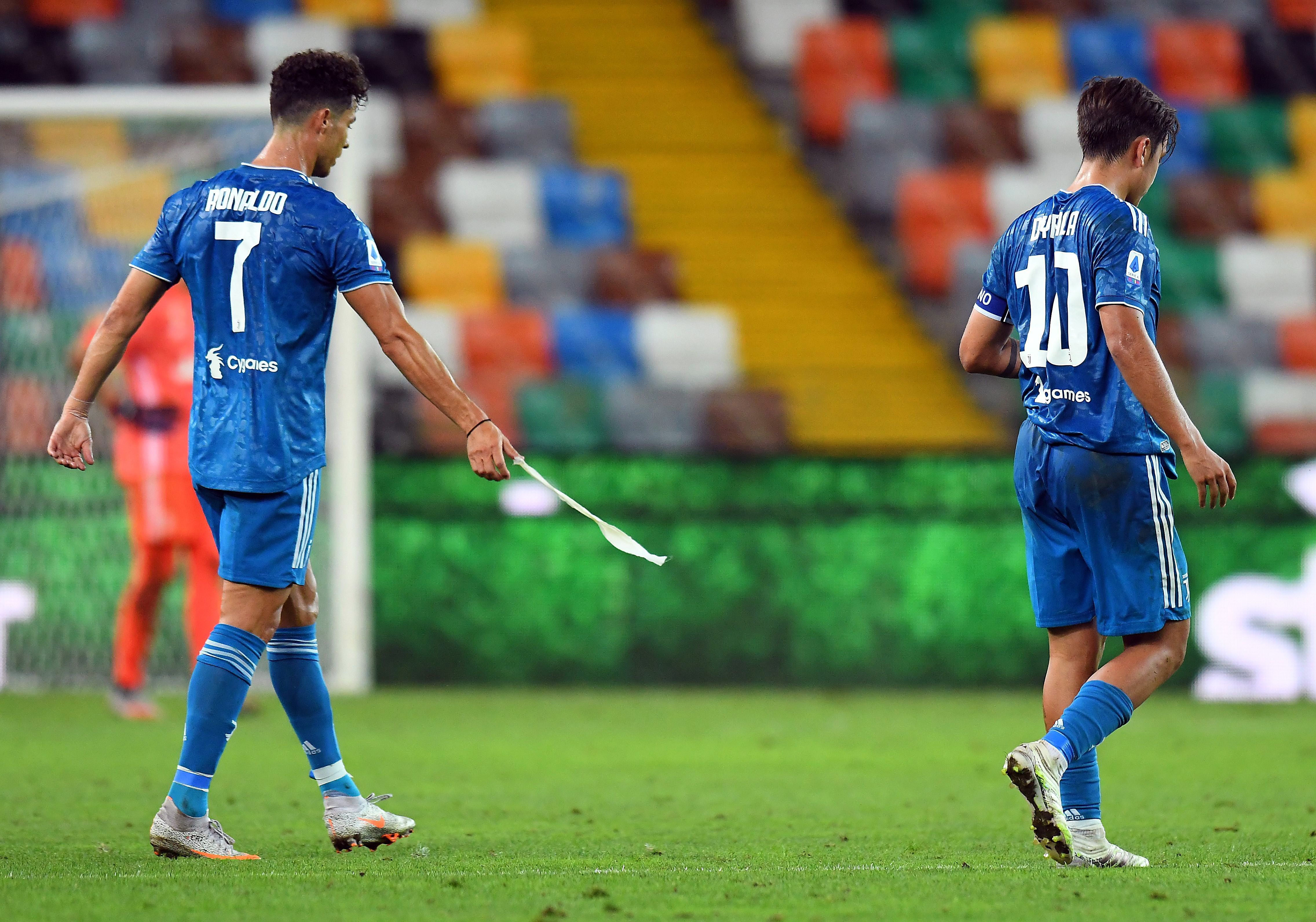 UDINE, ITALY - JULY 23: Cristiano Ronaldo and Paulo Dybala of Juventus reacts after the Serie A match between Udinese Calcio and Juventus at Stadio Friuli on July 23, 2020 in Udine, Italy. (Photo by Alessandro Sabattini/Getty Images)