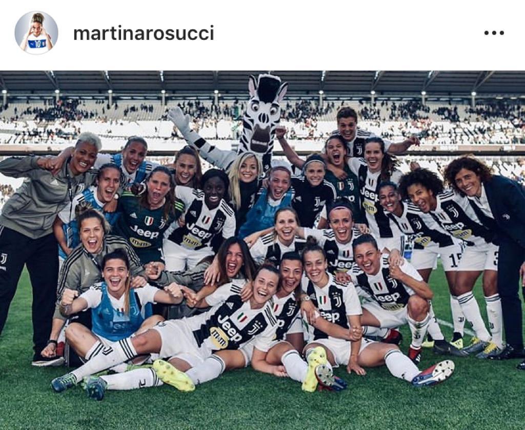 la Juventus Women può finalmente dare inizio alla festa tricolore. Ci ha pensato la bionda Martina Rosucci a dare il via alle celebrazioni, tramite il suo account Instagram, dove ha postato una foto che la ritrae insieme a tutta la squadra all’interno dello Stadium, dopo la vittoria maturata. Sotto l’immagine si può notare la seguente didascalia, con una dedica speciale alla compagna Cecilia Salvai.