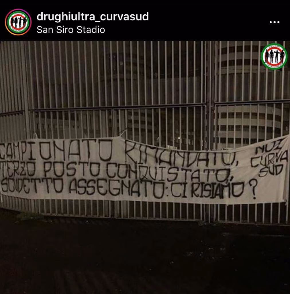 TORINO – Questa ultima giornata di campionato per molte squadre non si è disputata, a causa dell’emergenza Coronavirus che, si sta spargendo a macchia d’olio quasi su tutto il continente. Sono state tantissime le polemiche da parte delle tifoserie per la decisione di rinviare a maggio le gare, compreso il big match di Torino tra Juve e Inter che, ha fatto infuriare i sostenitori nerazzurri. Immediata è arrivata la replica degli ultras bianconeri che, nella notte hanno dato vita ad uno striscione apparso di fronte allo stadio San Siro che recita cosi: “Campionato rimandato, terzo posto conquistato, scudetto assegnato: ci risiamo?”, firmato dai Drughi.