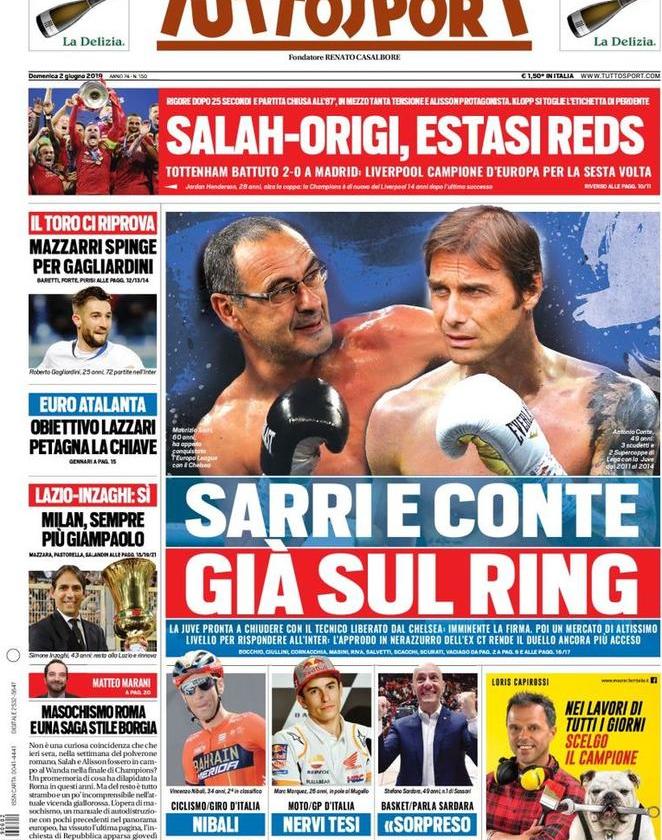 TORINO – La pagina di apertura del quotidiano nazionale, Tuttosport. In grande la notizia dell’avvicinamento di Sarri alla Juventus, con i bianconeri pronti a liberare il tecnico toscano ex Napoli, accordandosi col Chelsea. In alto poi la questione Champions di ieri sera e a lato il Toro che ci prova per Gagliardini dell’Inter.