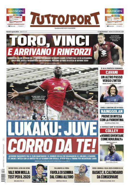 TORINO – Di seguito vi proponiamo l’apertura del quotidiano nazionale Tuttosport di oggi, 01/08/2019. In apertura la questione che riguarda Romelu Lukaku. “Corro da te, Juve” titola Tuttosport, invitando l’attaccante belga ad approfare a Torino. In alto l’EuroToro chiamato al ritorno dei preliminari con il Debrecen.