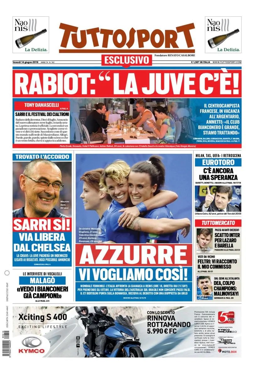 TORINO – Di seguito vi proponiamo l’apertura del quotidiano nazionale Tuttosport di oggi, 14/06/2019. In apertura la questione che riguarda Rabiot, che ha confermato dalla vacanza la sua trattativa in corso con la Juventus. A sinistra si parla di Sarri, e dell’accordo trovato con il Chelsea che può sbloccare definitivamente la trattativa.