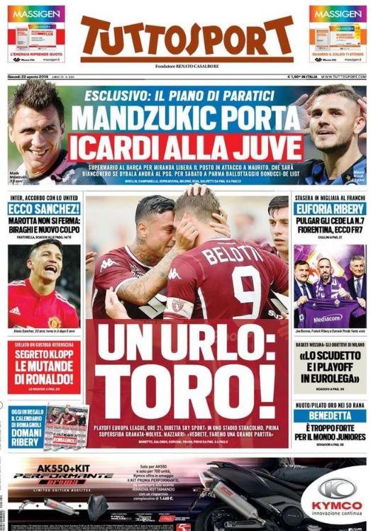 TORINO – Di seguito vi proponiamo l’apertura del quotidiano nazionale Tuttosport di oggi, 22/08/2019.