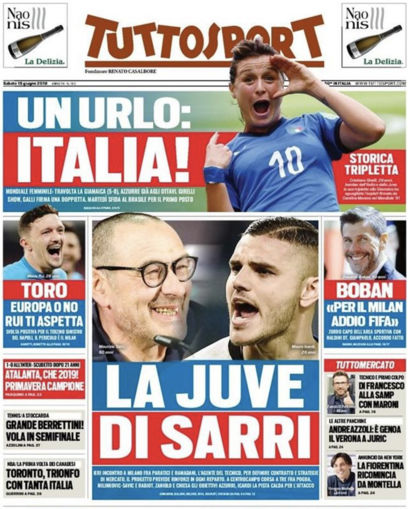 TORINO – Di seguito vi proponiamo l’apertura del quotidiano nazionale Tuttosport di oggi, 15/06/2019. In apertura la questione che riguarda il mondiale femminile, con la vittoria delle Azzurre per 5-0 sulla Giamaica. “La Juve di Sarri” è il secondo argomento di giornata, con Icardi in prima linea per il futuro.