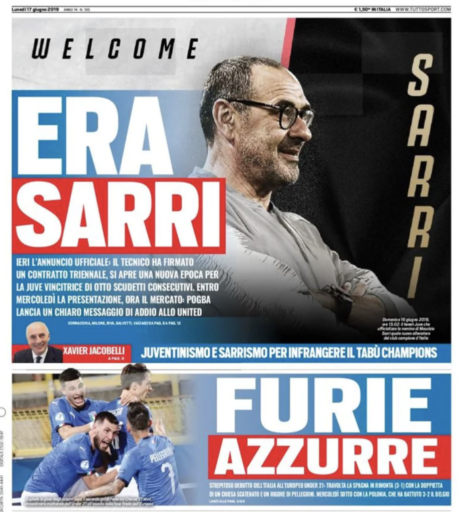 TORINO – Di seguito vi proponiamo l’apertura del quotidiano nazionale Tuttosport di oggi, 17/06/2019. In apertura la questione che riguarda l’annuncio ufficiale dato ieri per Maurizio Sarri alla Juventus. Ora il mercato, scrive Tuttosport, con Pogba che lancia un messaggio chiaro al Manchester United.