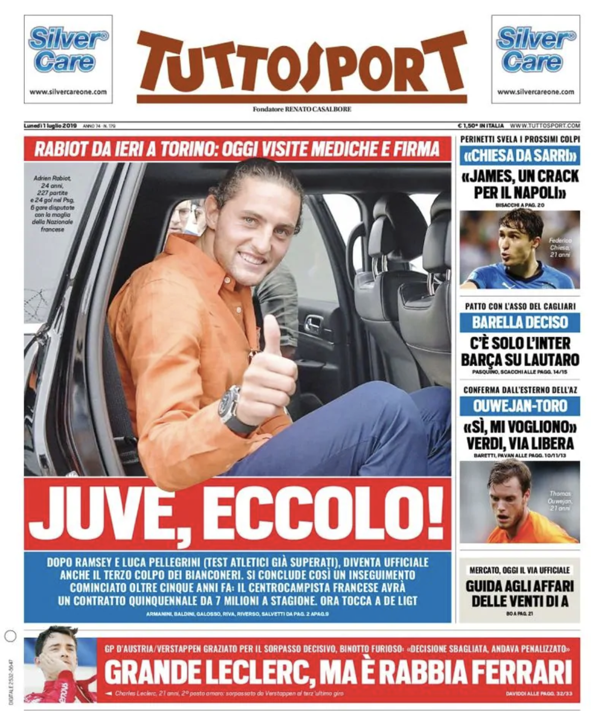 TORINO – Di seguito vi proponiamo l’apertura del quotidiano nazionale Tuttosport di oggi, 01/07/2019. Queste le principali questioni in apertura. Perinetti svela i prossimi colpi: “Chiesa da Sarri”. “James un crack per il Napoli”. Patto con l’asso del Cagliari, Barella deciso: c’è solo l’Inter