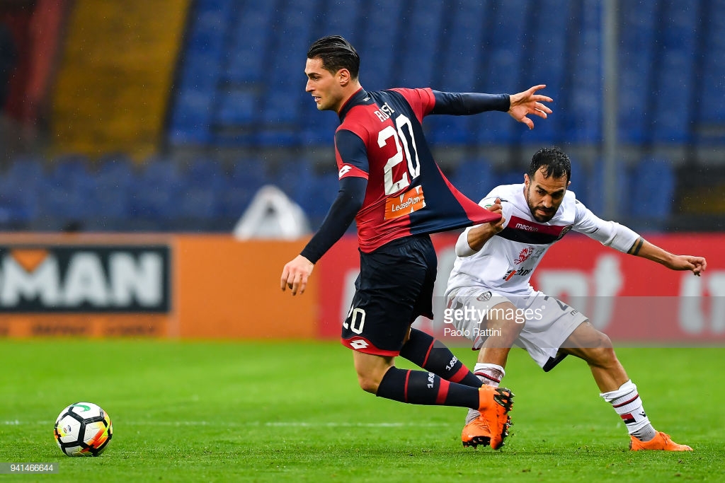 GENOA, ITALY - APRIL 03: Aleandro Rosi of Genoa and Marco Sau of Cagliari battle for the ball during the serie A match betweenGenoa CFC and Cagliari Calcio at Stadio Luigi Ferraris on April 3, 2018 in Genoa, Italy. (Photo by Paolo Rattini/Getty Images)