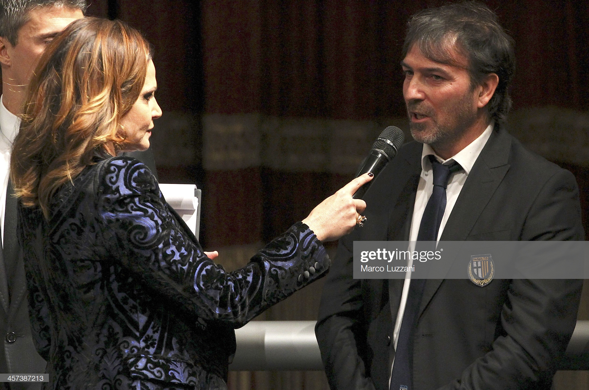 PARMA, ITALY - DECEMBER 16: (L-R) Simona Ventura and Alessandro Melli attend the FC Parma 100 years Anniversary at Teatro Regio on December 16, 2013 in Parma, Italy. (Photo by Marco Luzzani/Getty Images)