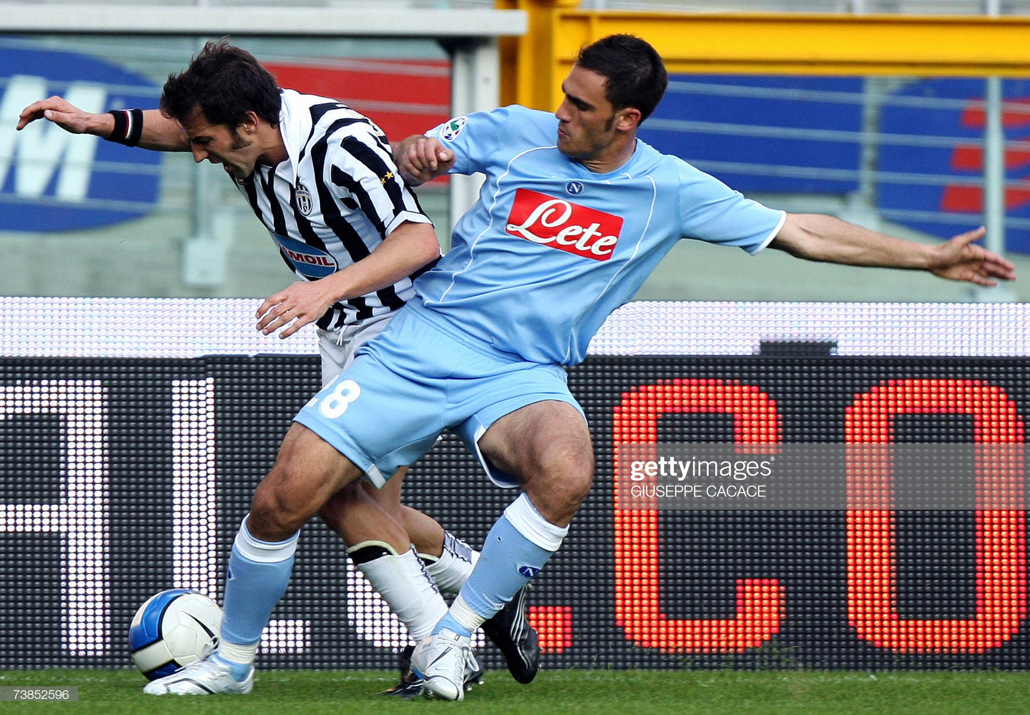 Turin, ITALY: Juventus' forward Alessandro Del Piero (L) vies for the ball with Napoli's midfielder Mariano Bogliacino during their Serie B match at Olympic Stadium, in Turin, 10 April 2007. Juventus won 2-0. AFP PHOTO / GIUSEPPE CACACE (Photo credit should read GIUSEPPE CACACE/AFP via Getty Images)
