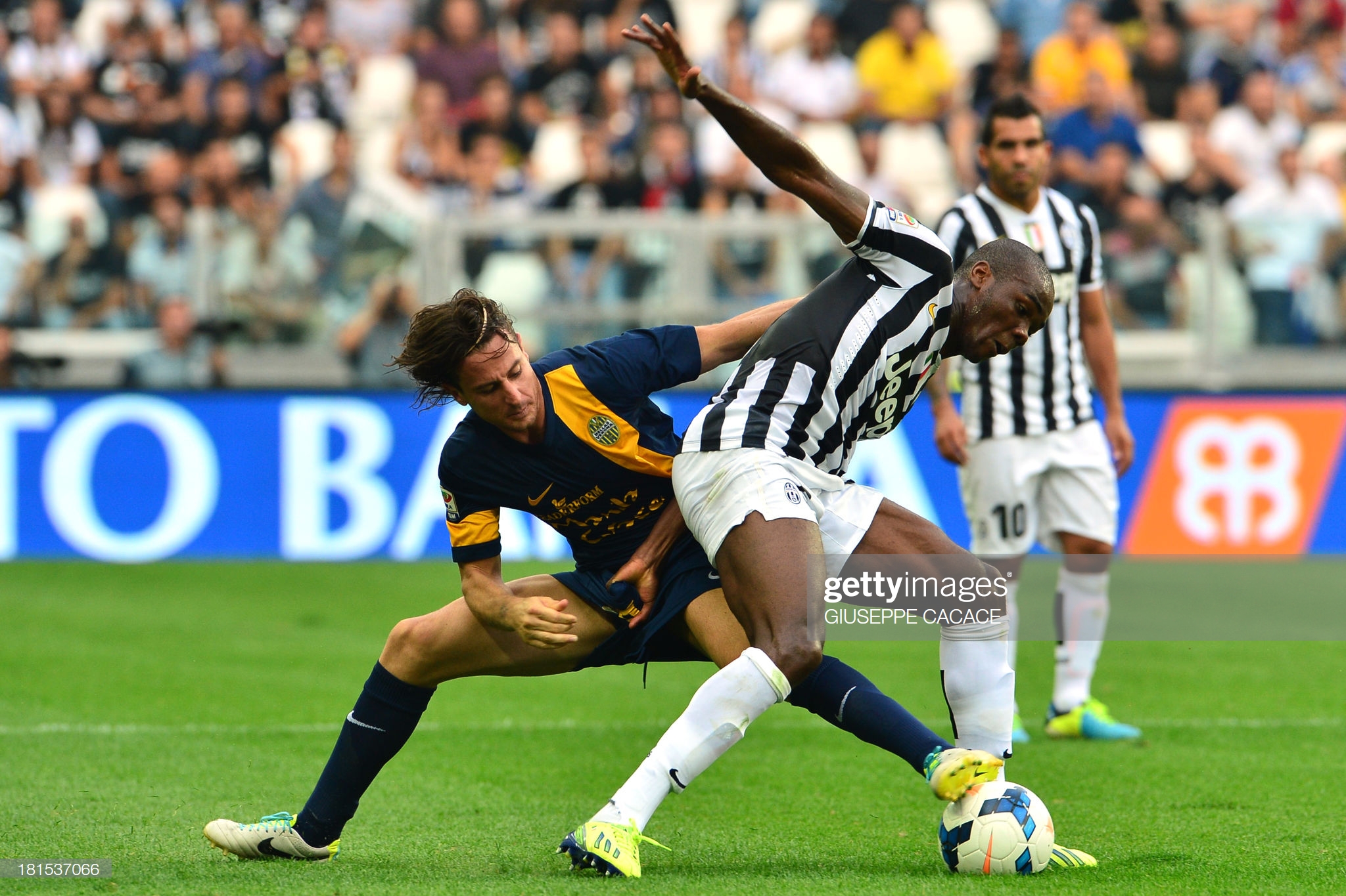 Juventus' defender Angelo Ogbonna (Front) vies with Hellas Verona's forward Daniele Cacia during the Italian Serie A football match Juventus vs Hellas Verona at "Juventus Stadium" in Turin on September 22, 2013 . AFP PHOTO / GIUSEPPE CACACE (Photo credit should read GIUSEPPE CACACE/AFP/Getty Images)