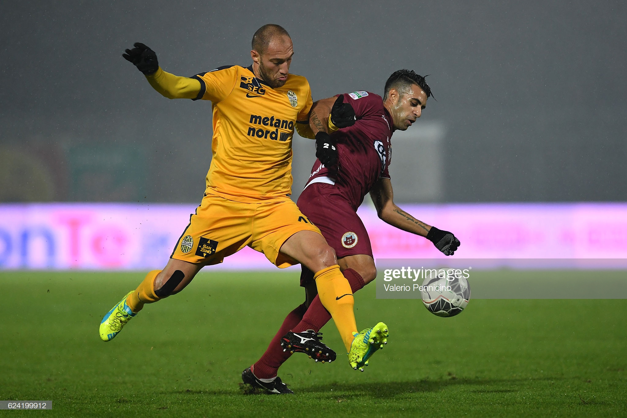CITTADELLA, ITALY - NOVEMBER 18: Andrea Schenetti (R) of AS Cittadella clashes with Davide Luppi of Hells Verona during the Serie B match between AS Cittadella and Hells Verona at Stadio Pier Cesare Tombolato on November 18, 2016 in Cittadella, Italy. (Photo by Valerio Pennicino/Getty Images)