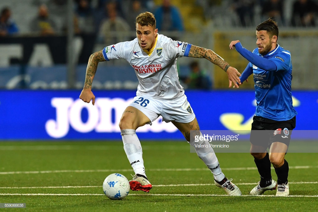 NOVARA, ITALY - OCTOBER 08: Gianluca Sansone (R) of Novara Calcio competes with Emanuele Terranova of Frosinone Calcio during the Serie B match between Novara Calcio and Frosinone Calcio at Silvio Piola Stadium on October 8, 2017 in Novara, Italy. (Photo by Valerio Pennicino/Getty Images)