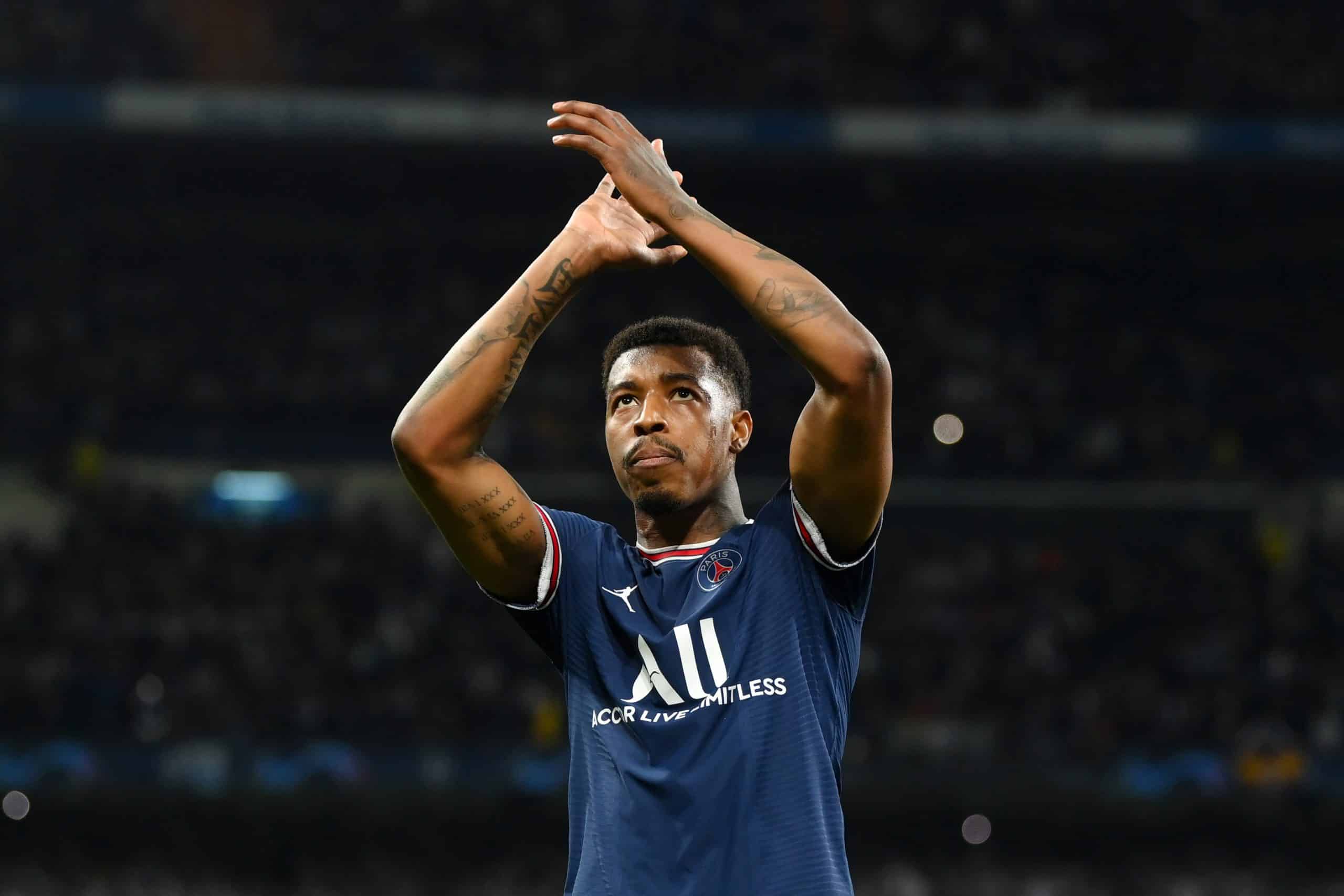 MADRID, SPAIN - MARCH 09: Presnel Kimpembe of Paris Saint-Germain acknowledges the fans following their side's defeat in the UEFA Champions League Round Of Sixteen Leg Two match between Real Madrid and Paris Saint-Germain at Estadio Santiago Bernabeu on March 09, 2022 in Madrid, Spain. (Photo by David Ramos/Getty Images)