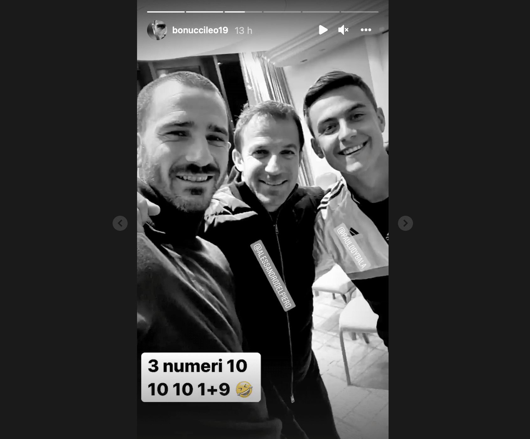 I bianconeri sono arrivati ieri nel tardo pomeriggio a Londra, e nel loro albergo hanno ricevuto una visita molto gradita: l’ex capitano e numero 10 dei bianconeri Alessandro Del Piero si è infatti presentato in albergo alla squadra bianconera, e il tutto è stato immortalato anche da Leonardo Bonucci attraverso le sue Instagram Stories: nella foto pubblicata infatti si vedono Del Piero, il numero 19 e Paulo Dybala, con Bonucci che ha accompagnato la foto con una scherzosa didascalia: “Tre numeri 10: 10, 10. 1+9” ha scritto il giocatore, scherzando con i suoi compagni.