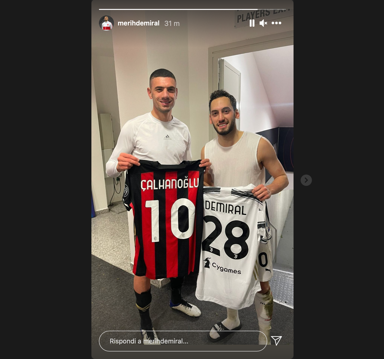 Protagonista della partita per la squadra rossonera è stato ieri sera Hakan Calhanoglu, che ha tenuto impegnata la difesa bianconera per tutto il tempo, ma venendo limitato dai difensori di Andrea Pirlo. Difensori che sono scesi quasi tutti in campo, con il connazionale del numero 10 del Milan Merih Demiral che è entrato nel finale della partita, per continuare a mettere minuti nelle gambe in vista delle prossime partite. Al termine del match i due connazionali si sono incontrati negli spogliatoi, dove si sono salutati e si sono scambiati le maglie, immortalando il momento con una foto postata sulle Instagram Stories del difensore bianconero.