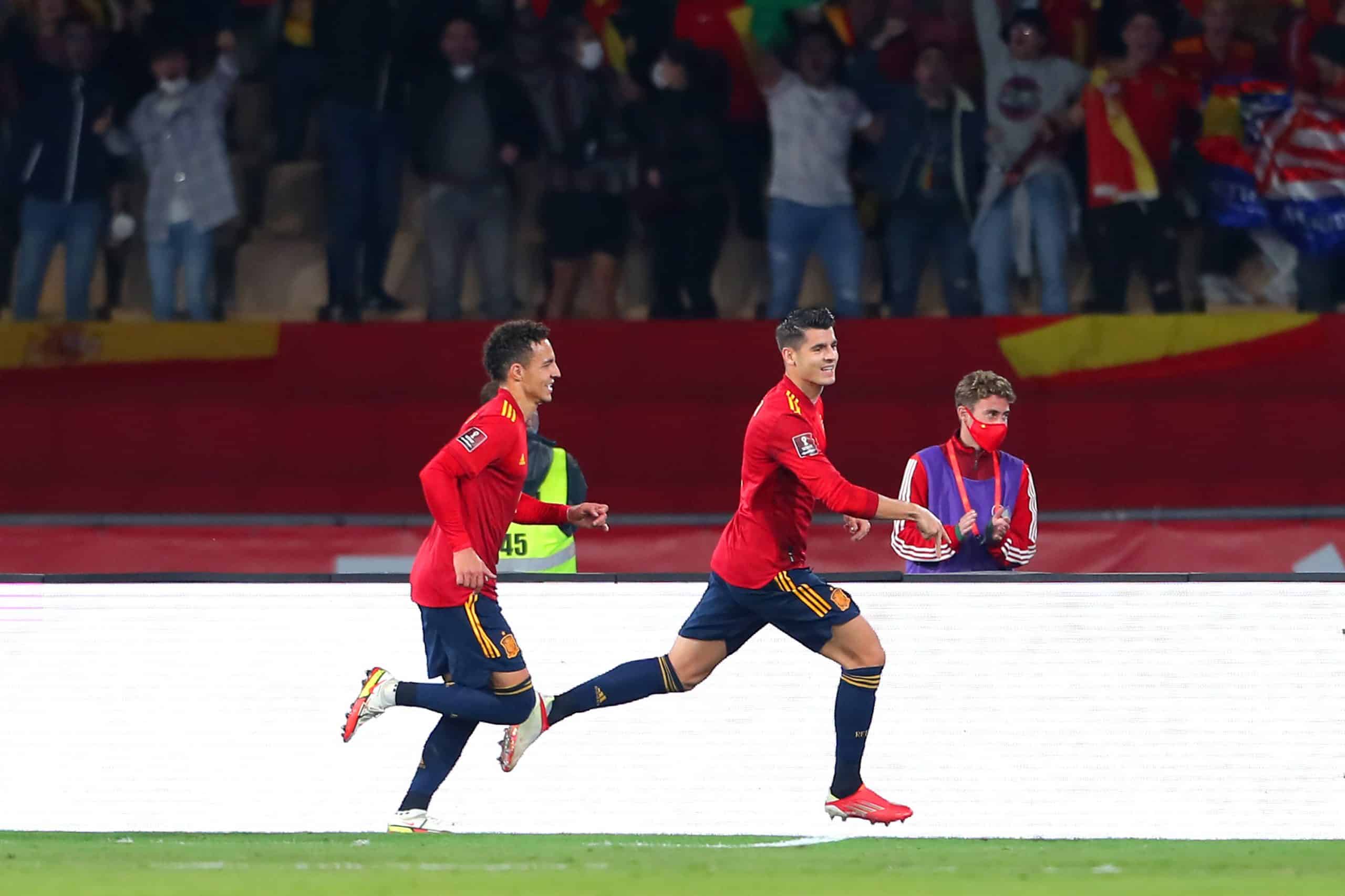 SEVILLE, SPAIN - NOVEMBER 14: Alvaro Morata of Spain celebrates after scoring their side's first goal during the 2022 FIFA World Cup Qualifier match between Spain and Sweden at Estadio de La Cartuja on November 14, 2021 in Seville, . (Photo by Fran Santiago/Getty Images)