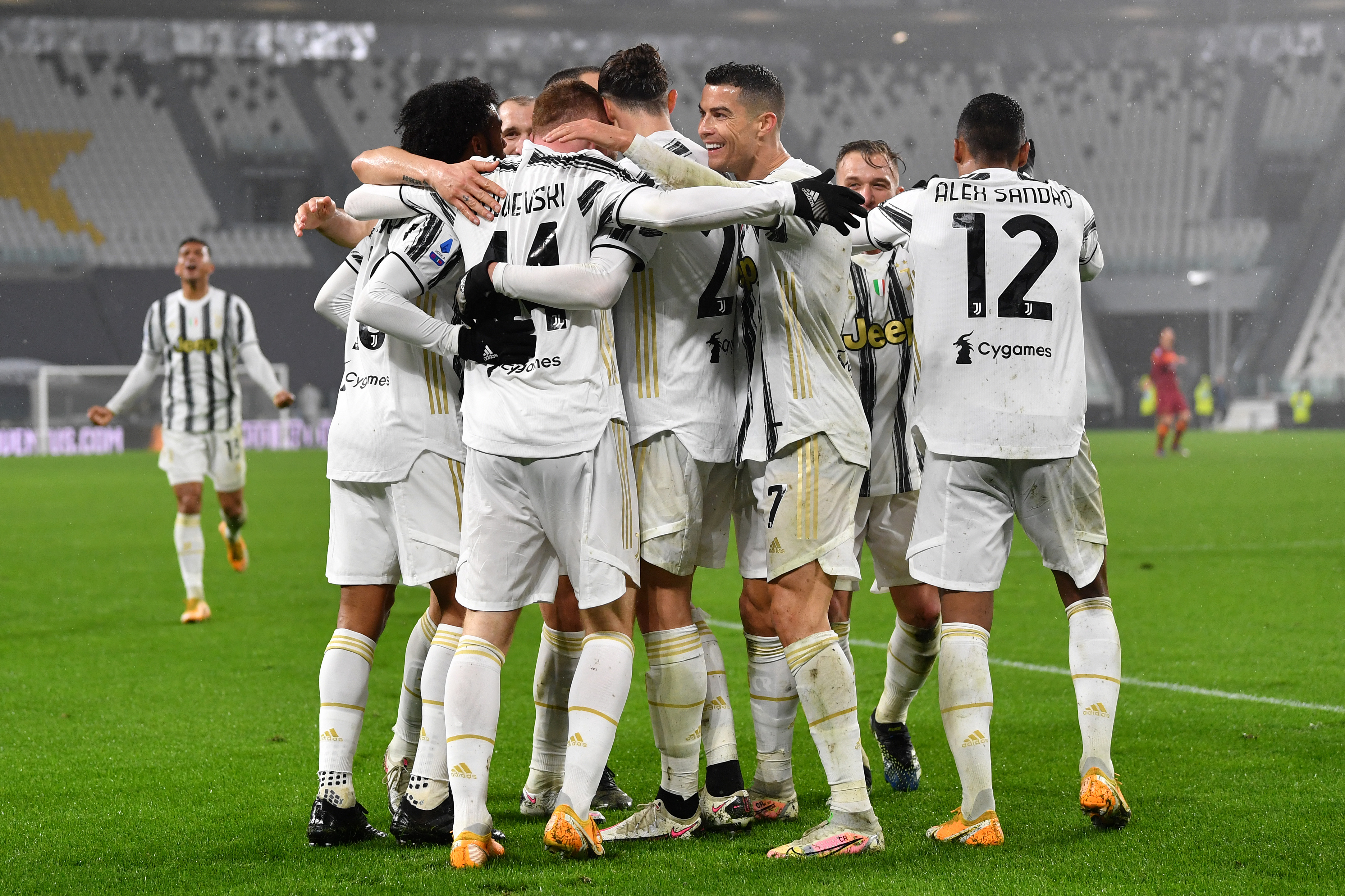 I giocatori bianconeri esultano dopo l'autorete di Ibanez in Juventus-Roma