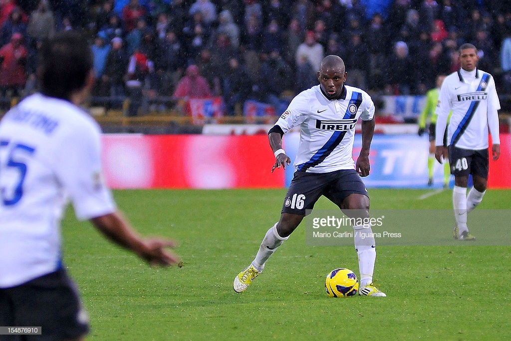 BOLOGNA, ITALY - OCTOBER 28: Gaby Mudingayi # 16 of FC Internazionale in action during the Serie A match between Bologna FC and FC Internazionale Milano at Stadio Renato Dall'Ara on October 28, 2012 in Bologna, Italy. (Photo by Mario Carlini / Iguana Press/Getty Images)