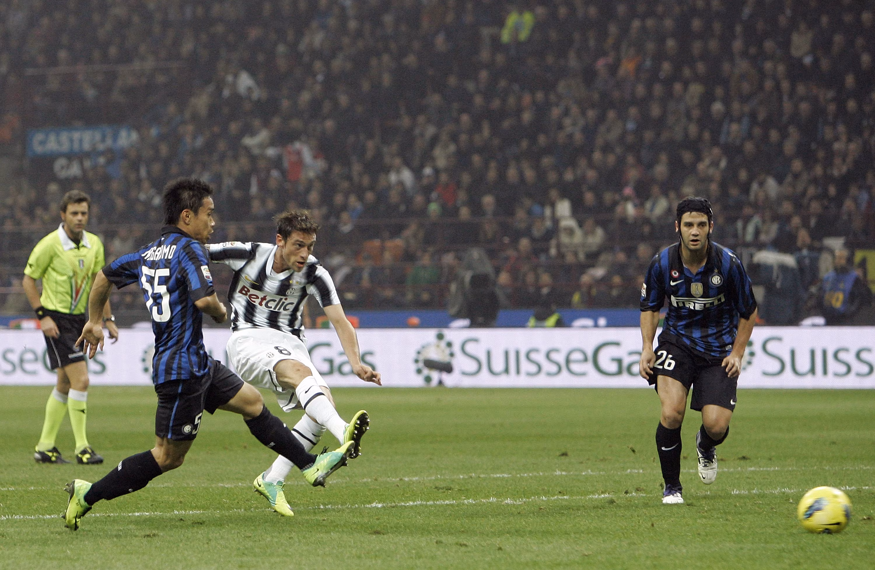 MILAN, ITALY - OCTOBER 29: Claudio Marchisio of Juventus FC scores the goal 1:2 during the Serie A match between FC Internazionale Milano and Juventus FC at Stadio Giuseppe Meazza on October 29, 2011 in Milan, Italy. (Photo by Marco Luzzani/Getty Images)