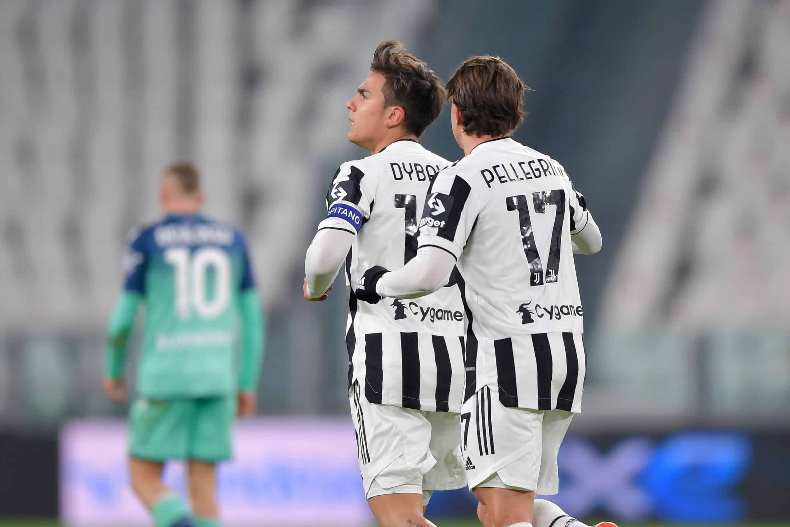 TURIN, ITALY - JANUARY 15: Paulo Dybala of Juventus celebrates after scoring the 1-0 goal with teammate Luca Pellegrini during the Serie A match between Juventus and Udinese Calcio at Allianz Stadium on January 15, 2022 in Turin, Italy. (Photo by Daniele Badolato - Juventus FC/Juventus FC via Getty Images)