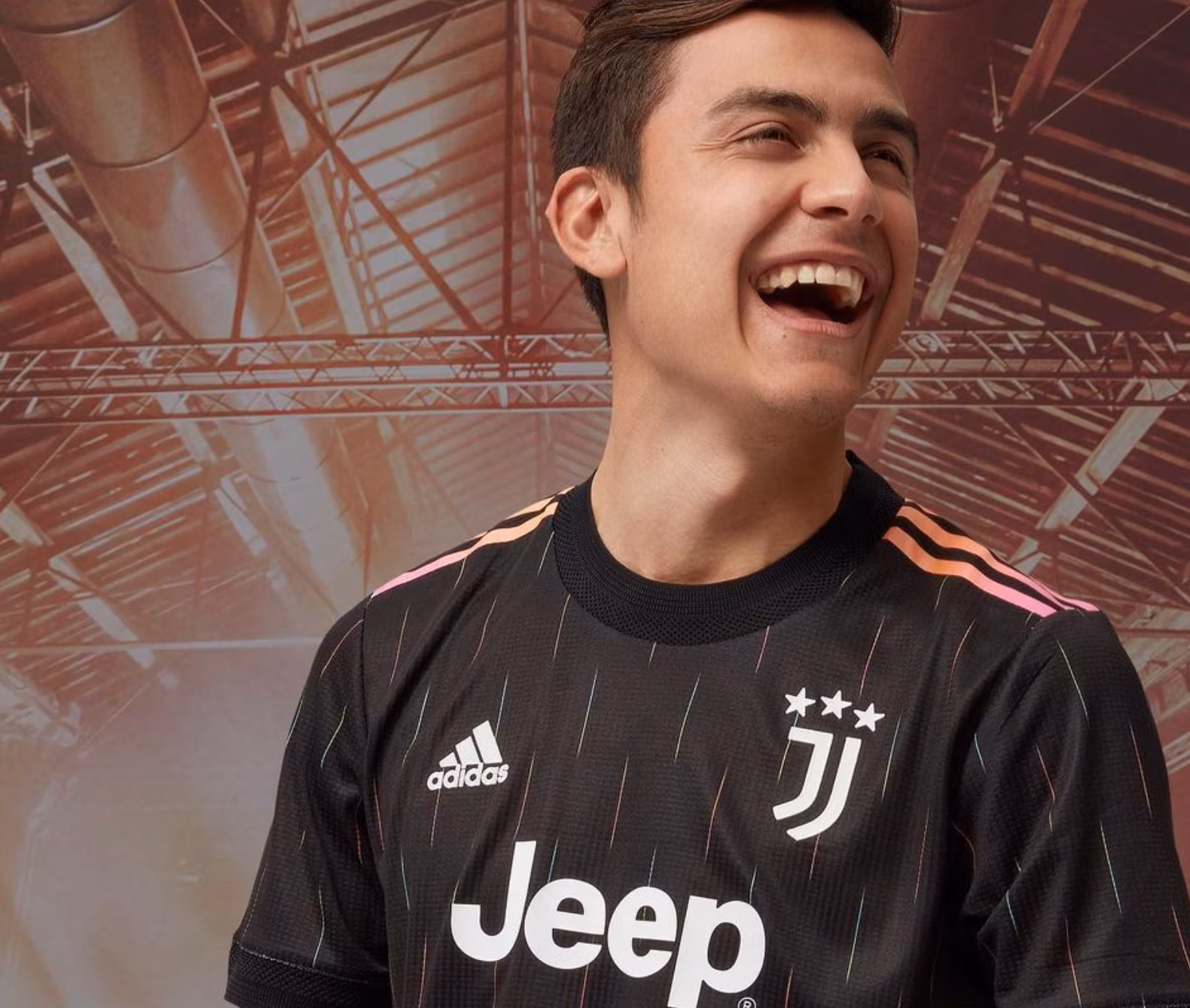 La maglia, presentata da Paulo Dybala, Weston McKennie e Martina Rosucci, si presenta con il nero come colore principale, con strisce sulle spalle che vanno dall’arancione al rosa, e il tema “all over”, che dovrebbe trarre ispirazione dalla scena musicale elettronica torinese, su tutta la maglia: si tratta di pinstripes sottilissime e sfalsate dalla tonalità gradiente. Logo e sponsor saranno in bianco, con il main sponsor Jeep 4xe anch’esso in bianco.