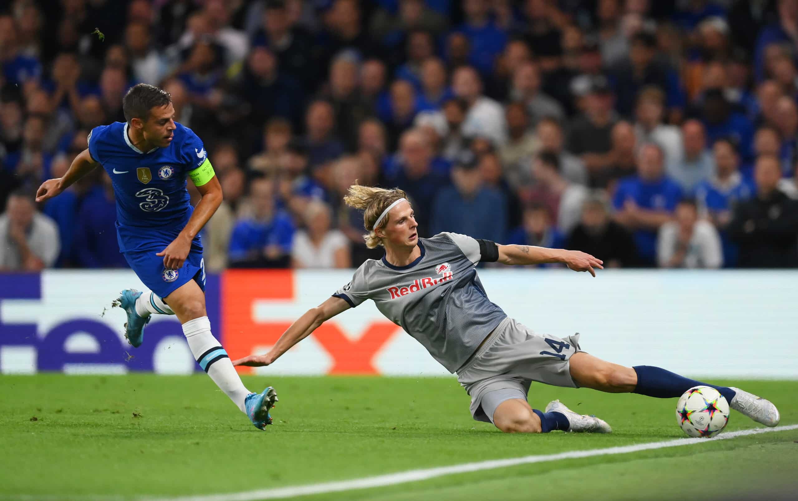LONDON, ENGLAND - SEPTEMBER 14: Maurits Kjaergaard of Red Bull Salzburg stretches to keep the ball in play as they are challenged by Cesar Azpilicueta of Chelsea during the UEFA Champions League group E match between Chelsea FC and FC Salzburg at Stamford Bridge on September 14, 2022 in London, England. (Photo by Mike Hewitt/Getty Images)