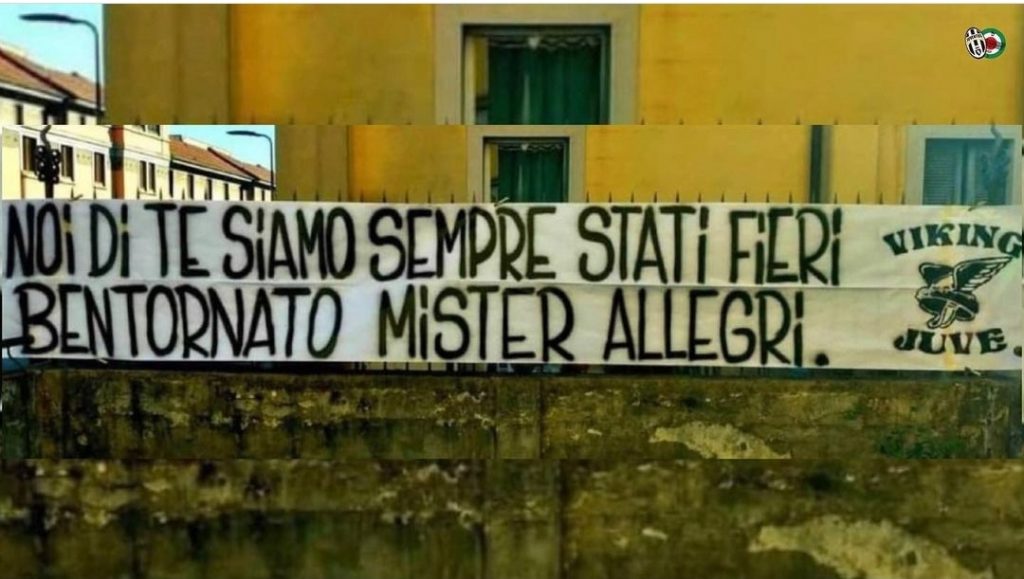 In casa Juve c’é un’aria di gioia irrefrenabile dopo l’annuncio del ritorno di Massimiliano Allegri sulla panchina dei bianconeri. Il tecnico livornese infatti, non era mai stato dimenticato dai tifosi juventini e il suo approdo sotto la Mole era stato gridato a gran voce nei giorni precedenti, tanto da materializzarsi nel giro di poche ore. Gioia che é stata manifestata anche da una parte della curva dei sostenitori della Vecchia Signora, i quali hanno esposto uno striscione per le vie di Torino, per omaggiare il ritorno di Allegri nel quartier generale della Continassa: ” Noi di te siamo sempre stati fieri. Bentornato mister Allegri”. Questo é quanto scritto dal gruppo ‘Viking’. Una gran bella rivincita per Max, se si considera soprattutto come fu accolto al suo arrivo a Torino.