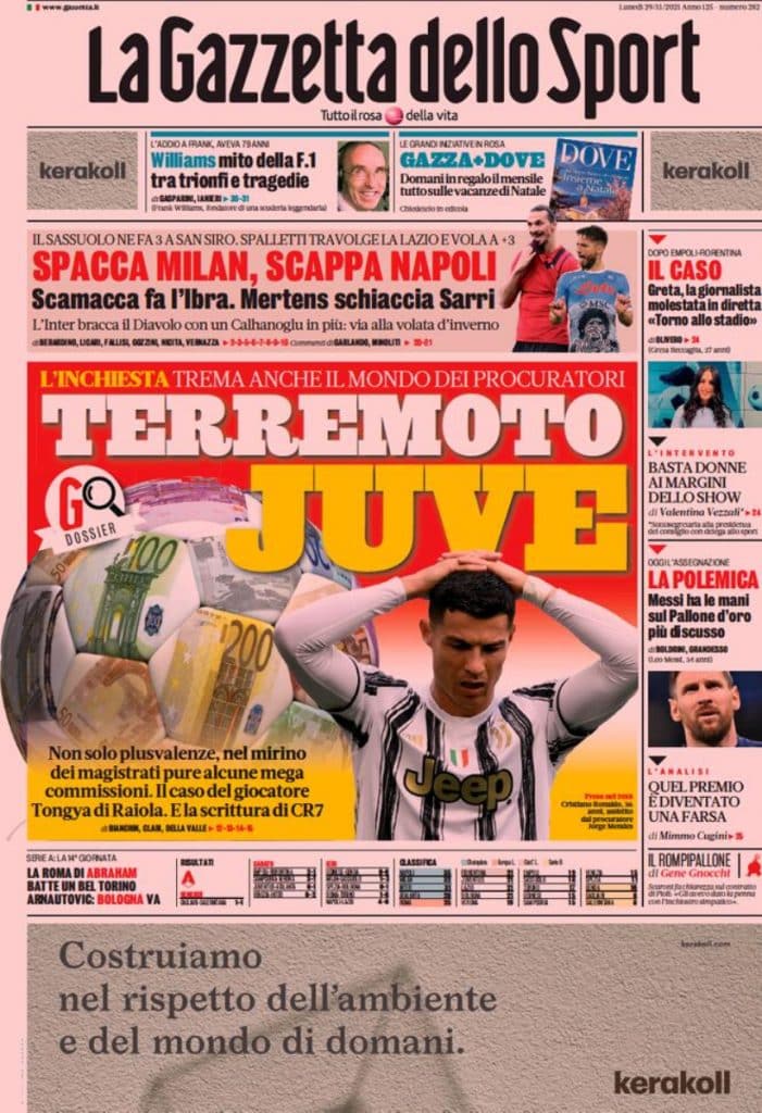 “Terremoto Juve” intitola La Gazzetta dello Sport in prima pagina. I problemi dei bianconeri, purtroppo, non si fermano al rettangolo verde di gioco.