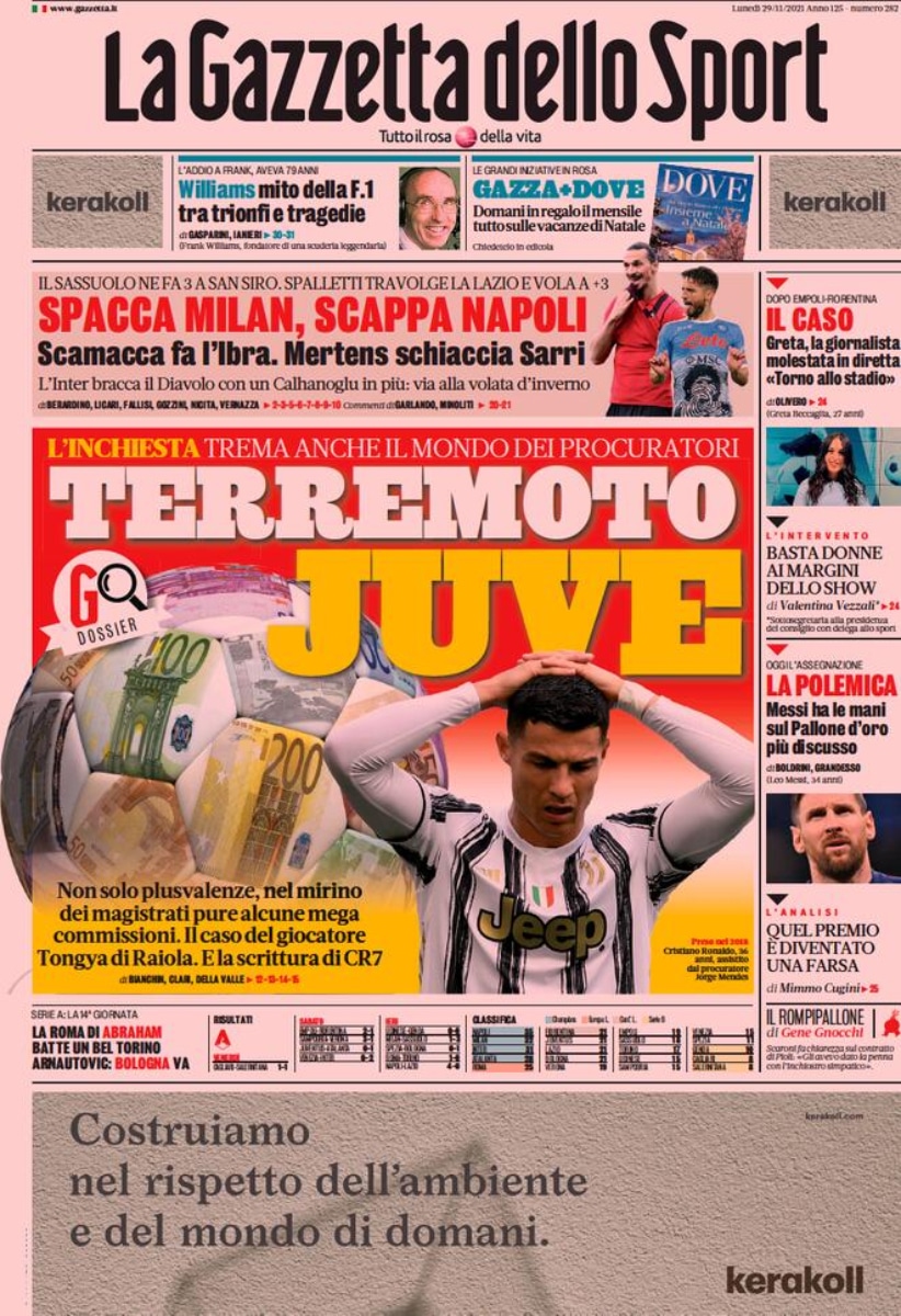 “Terremoto Juve” intitola La Gazzetta dello Sport in prima pagina. I problemi dei bianconeri, purtroppo, non si fermano al rettangolo verde di gioco.