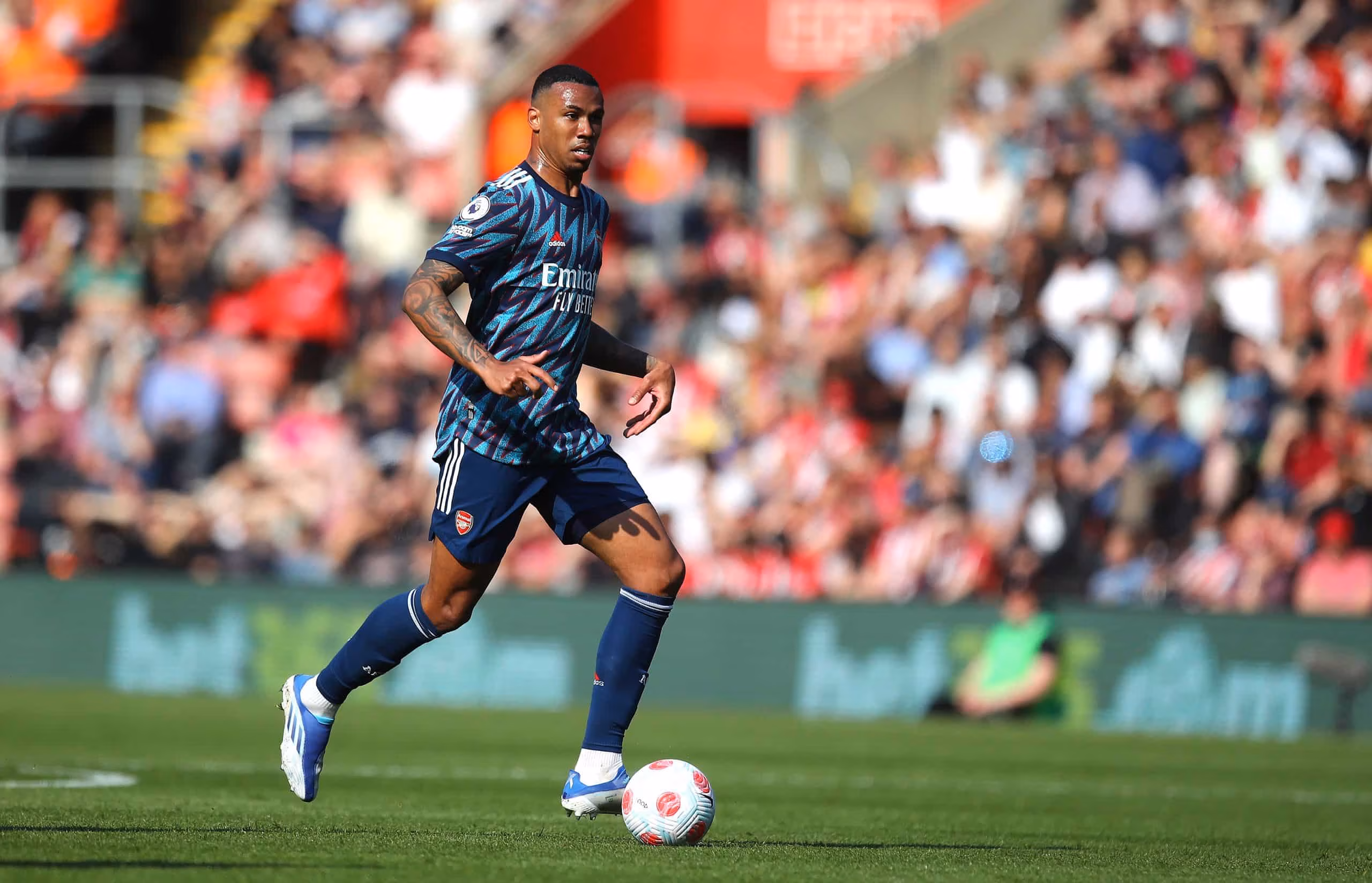 SOUTHAMPTON, ENGLAND - APRIL 16: Gabriel Magalhães of Arsenal in actio during the Premier League match between Southampton and Arsenal at St Mary's Stadium on April 16, 2022 in Southampton, England. (Photo by Pete Norton/Getty Images)