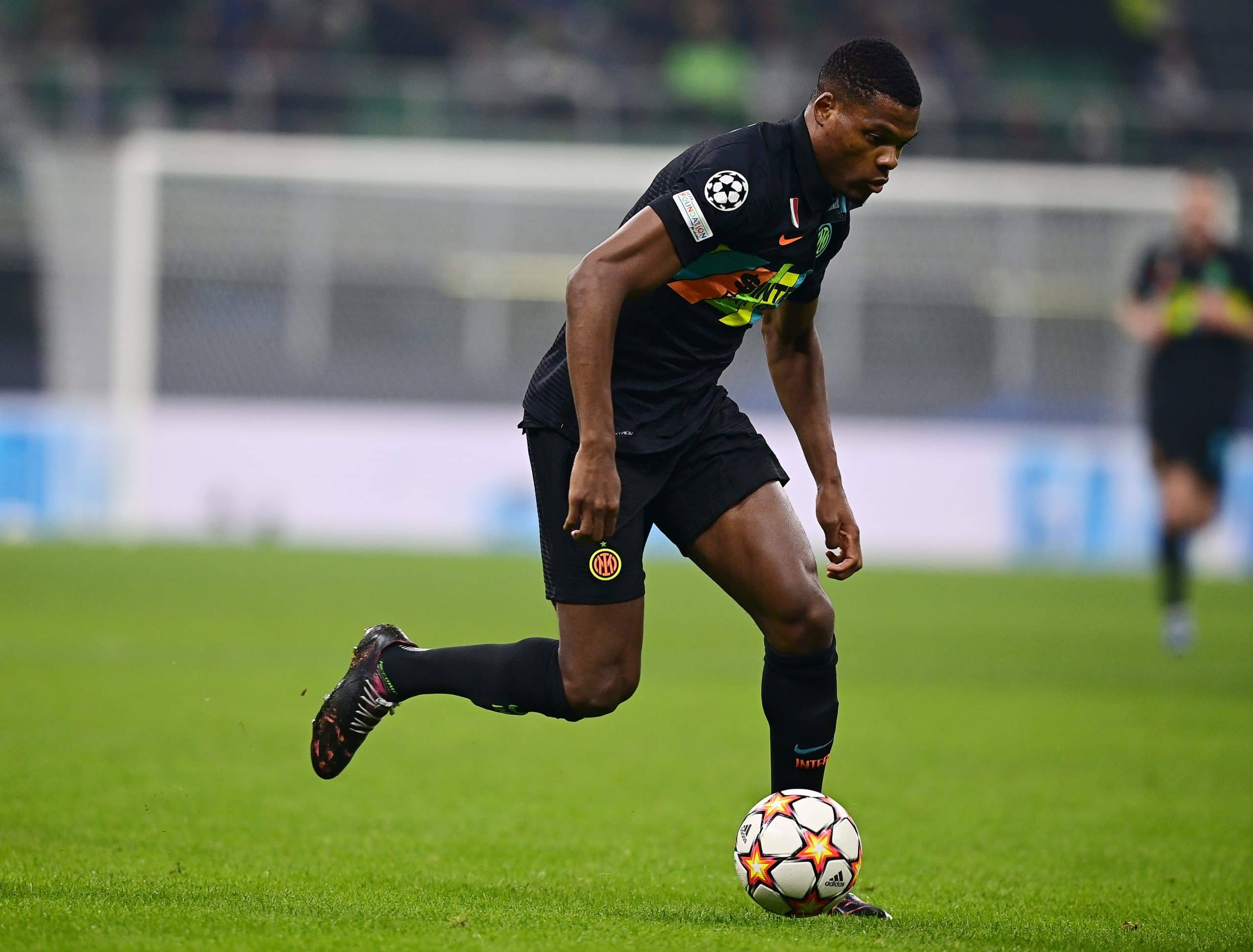 MILAN, ITALY - OCTOBER 19: Denzel Dumfries of FC Internazionale in actin during the UEFA Champions League group D match between FC Internazionale and FC Sheriff at Giuseppe Meazza Stadium on October 19, 2021 in Milan, Italy. (Photo by Mattia Ozbot - Inter/Getty Images)