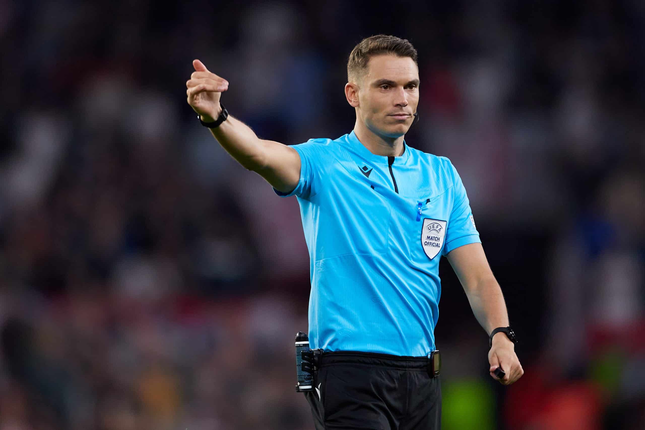 SEVILLE, SPAIN - MARCH 10: Referee Sandro Scharer reacts during the UEFA Europa League Round of 16 Leg One match between Sevilla FC and West Ham United at Estadio Ramon Sanchez Pizjuan on March 10, 2022 in Seville, Spain. (Photo by Fran Santiago/Getty Images)