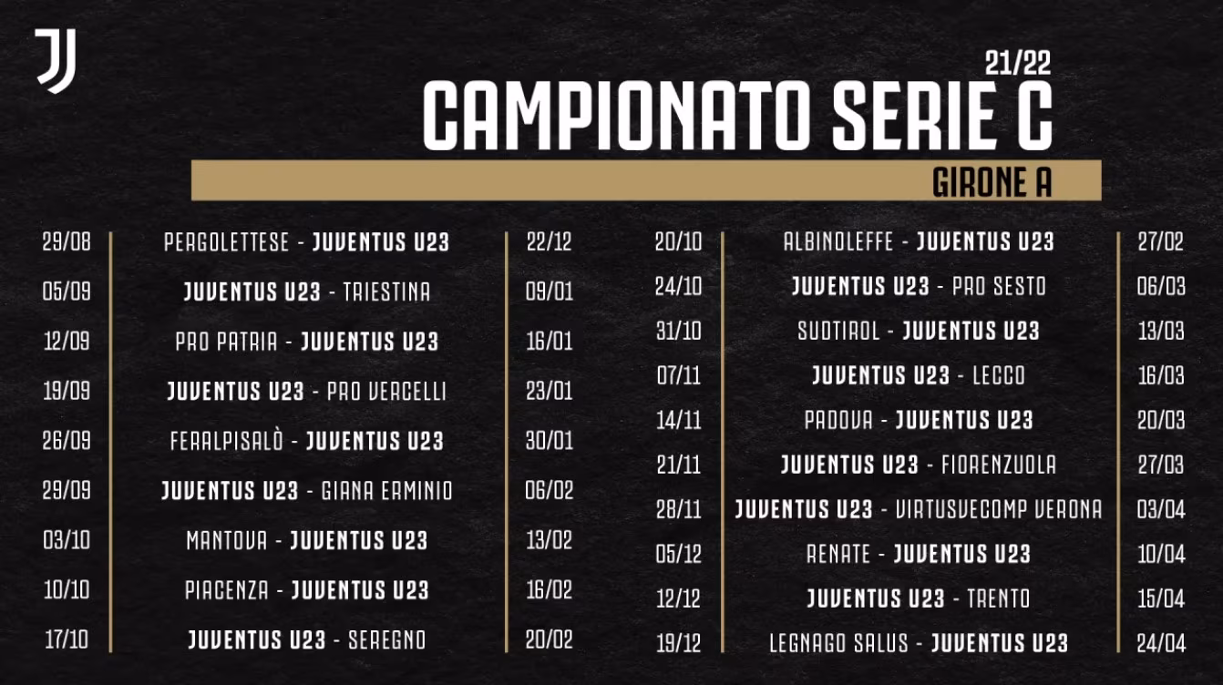 Anche la regular season della Juve si aprirà con una trasferta e nel week-end del 28/29 agosto la metterà di fronte alla Pergolettese, mentre chiuderà i conti la gara casalinga contro il Legnago Salus nel fine settimana del 23/24 aprile 2022. L’unico derby tutto piemontese è quello contro la Pro Vercelli: gara di andata, in casa, in programma per il 18/19 settembre e gara di ritorno fissata per il 22/23 gennaio 2022. Saranno 5 i turni infrasettimanali e l’unica sosta prevista sarà quella tra la prima e la seconda giornata di ritorno (dal 23 dicembre al 7 gennaio 2022). Di seguito il calendario completo”.