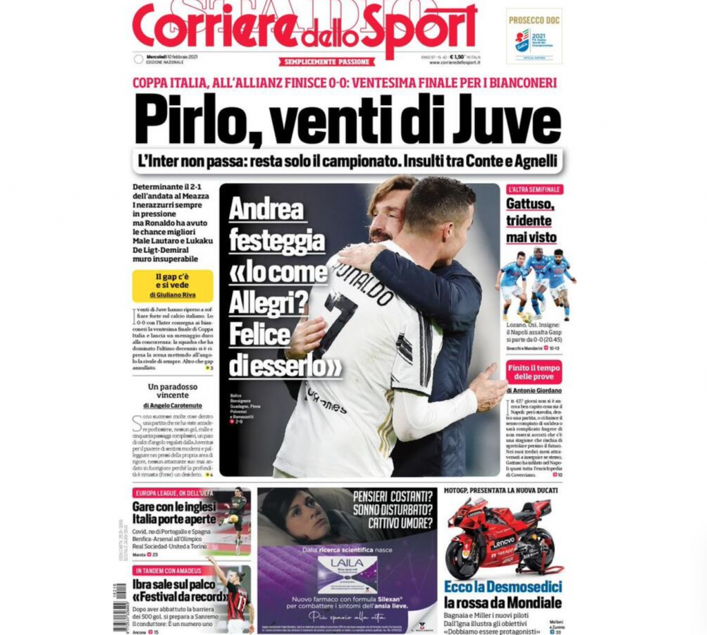 Sotto il titolo in alto poi le parole di Andrea Pirlo, riportate insieme alla foto che lo ritrae abbreviare sorridente Cristiano Ronaldo al termine della partita di ieri sera: “Andrea festeggia “Io come Allegri? Felice di esserlo”. Di spalla spazio all’altra semifinale di Coppa Italia, che andrà di scena questa sera, tra Atalanta e Napoli, che partiranno dallo 0-0 del match di andata. “L’altra semifinale. Gattuso, tridente mai visto. Lozano, Osi, Insigne: il Napoli assalta Gasp. Si parte da 0-0.”