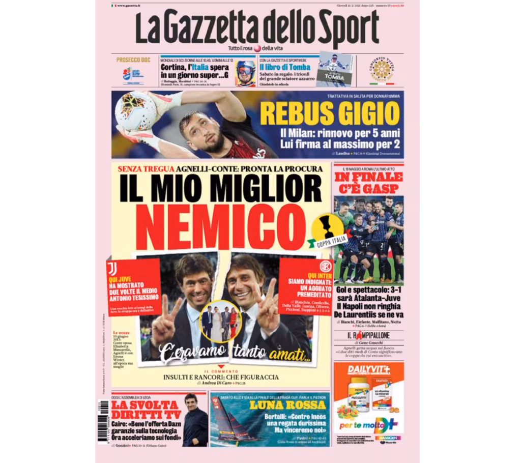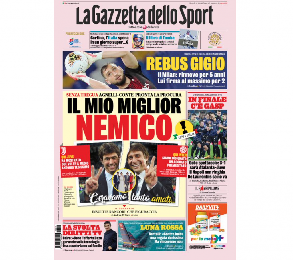 TORINO – La prima pagina de La Gazzetta dello Sport in edicola oggi dedica il suo taglio alto al Milan e al rinnovo del portiere rossonero Gianluigi Donnarumma: “Rebus Gigio. Il Milan: rinnovo per cinque anni. Lui firma al massimo per due”. La parte centrale è ancora dedicata alla lite scoppiata durante e dopo la semifinale di Coppa Italia tra il tecnico dell’Inter Antonio Conte e il Presidente della Juventus Andrea Agnelli: “Senza tregua. Il mio miglio nemico. Agnelli-Conte: pronta la procura. Qui Juve. Ha mostrato due volte il medio, Antonio tesissimo. Qui Inter. Siamo indignati: un agguato premeditato”. Di spalla l’Atalanta: “In finale c’è Gasp. Gol e spettacolo: 3-1. Il 19 maggio a Roma c’è l’ultimo atto. Sarà Atalanta-Juve. Il Napoli non ringhia, De Laurentiis se ne va”.