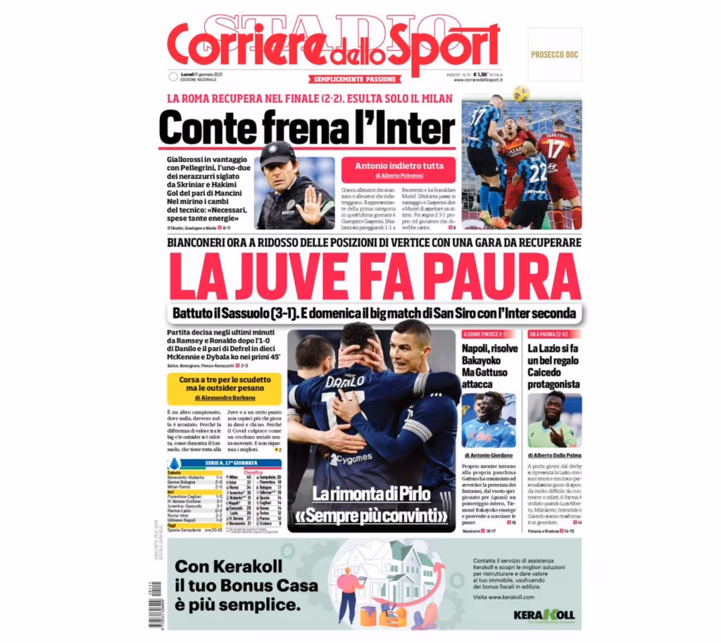 Anche la prima pagina de Il Corriere dello Sport in edicola oggi è dedicata ai risultati della Juventus e di Inter e Roma, fermate a vicenda sul pareggio per 2-2. “La Juve fa paura. Bianconeri già a ridosso delle posizioni di vertice con una gara da recuperare. Battuto il Sassuolo 3-1. E domenica il big match di San Siro contro l’Inter. Partita decisa negli ultimi minuti da Ramsey e Ronaldo dopo l’1-0 di Danilo e il pari di Defrel in dieci. McKennie e Dybala ko nei primi 45 minuti”. Spazio anche alle dichiarazioni del tecnico bianconero Andrea Pirlo: “La rimonta di Pirlo: “Sempre più convinti”.