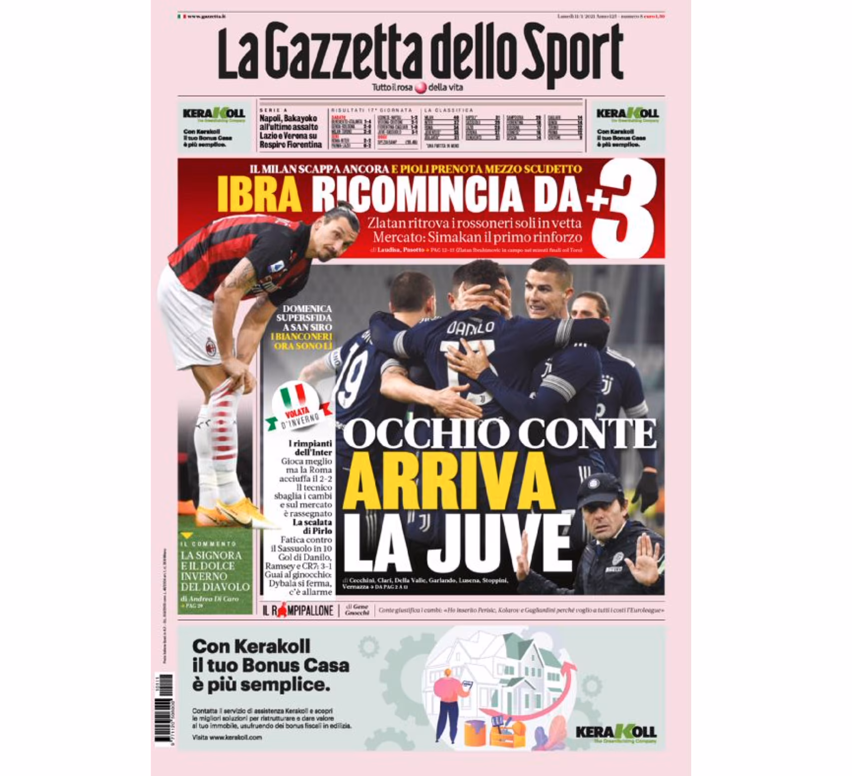 In quarta posizione in classifica, a sette punti di distacco dal Milan capolista, quattro dall’Inter e uno dalla Roma con una partita da recuperare c’è la Juventus, vincitrice ieri sera nel posticipo contro il Sassuolo per 3-1, alla quale è dedicata la parte centrale del giornale, che si concentra sulla vittoria ottenuta dagli uomini di Pirlo contro la squadra di De Zerbi, e si focalizza sulla prossima sfida di campionato in programma domenica prossima, e che vedrà Inter e Juventus sfidarsi a San Siro, con le due squadre impegnate mercoledì in Coppa Italia.