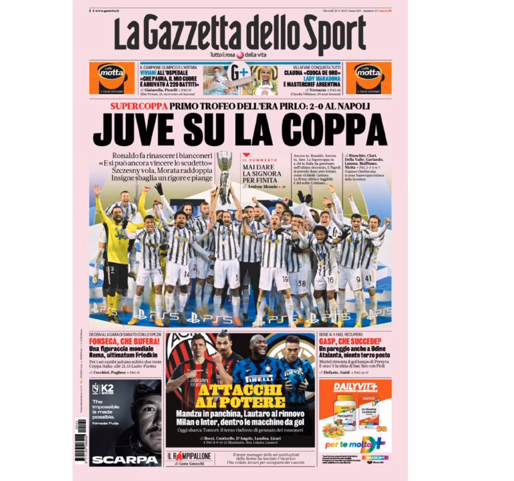TORINO – La prima pagina de La Gazzetta dello Sport in edicola oggi è dedicata alla Juventus, che ieri sera ha vinto contro il Napoli la Supercoppa Italiana. Al Mapei Stadium di Reggio Emilia i bianconeri si sono imposti per 2 reti a 0 grazie ai gol di Cristiano Ronaldo e dello spagnolo Alvaro Morata, subentrato nel corso della partita e capace di timbrare il cartellino nei minuti finali. “Supercoppa. Primo trofeo dell’era Pirlo: 2-0 al Napoli. Juve su la coppa. Ronaldo fa rinascere i bianconeri, “E si può ancora vincere lo Scudetto”. Szczesny vola, Morata raddoppia, Insigne sbaglia un rigore e piange”.