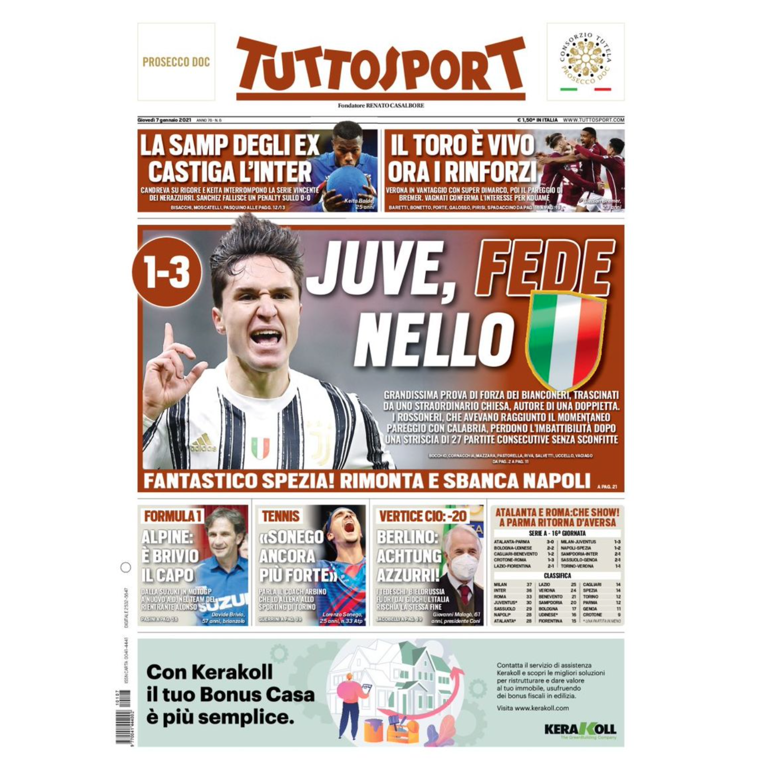 La prima pagina de Il Corriere dello Sport dedica la sua apertura al big match di ieri sera tra Juventus e Milan, vinto dai bianconeri che hanno così diminuito il loro distacco dalla capolista a sette punti, con una partita ancora da recuperare. “La capolista si ferma dopo 27 partite senza sconfitte. Pioli: noi a testa alta. Chiesa Scudetto. Uno strepitoso Federico affonda il Milan per 3-1, la Juve torna in corsa. Pirlo riaggancia il treno per il titolo: due volte a segno l’ex viola e gol di McKennie. Di Calabria il temporaneo pari. Bene Dybala, a secco Ronaldo”. “Rubo in allenamento i segreti di Cristiano” le parole di Chiesa riportate dal giornale in basso. “L’Inter fallisce la prova del nove: punita dalla Samp degli ex” e “La Roma fa sul serio e ora aspetta Conte” i titoli dedicate alle altre due squadre in cima alla classifica.