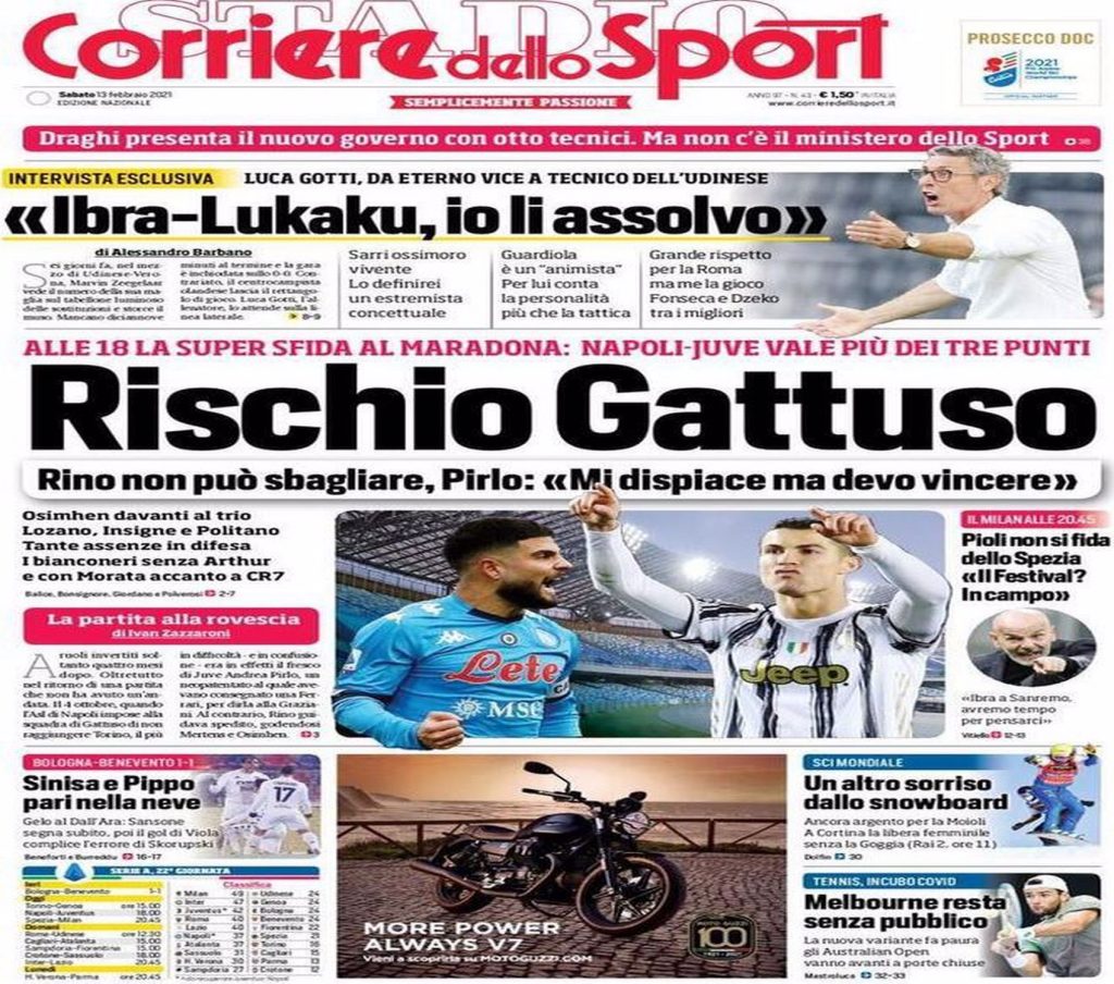 Poi ancora: “Scudetto? Noi guardiamo a noi e pensiamo a vincere e fare più punti possibili. Non guardiamo chi ci sta dietro ma chi è davanti, quindi andremo a Napoli per vincere e cercare di conquistare i tre punti. Gattuso? Fa parte del nostro lavoro, può capitare di avere problemi. Pensiamo sempre a fare il massimo, le partite sono sempre importanti poi può capitare che per uno o per l’altro ci sono momenti difficili. Mi spiace della situazione di Rino ma penso ai miei problemi, e dovremo cercare di fare bene”. Sulla stessa scia di quello di Tuttosport è il titolo del QS: “Napoli-Juve, altra finale”. Una finale per il Napoli perché l’eventuale sconfitta contro i bianconeri potrebbe costare la panchina a Gennaro Gattuso e potrebbe far svanire agli azzurri un possibile posto alla prossima Champions League per l’anno prossimo. Ma è una finale anche per Pirlo: in caso di sconfitta, i bianconeri si allontanerebbero di nuovo dalle prime 2 e dalla corsa per lo scudetto.