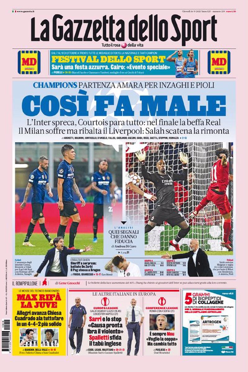 [fncvideo id=670034 autoplay=true] La prima pagina de La Gazzetta dello Sport di oggi intitola così: “Così fa male”. Il titolo è riferito alla sconfitta di ieri sera dell’Inter in Champions League contro il Real Madrid, partita in cui i nerazzurri hanno dominato e mantenuto il controllo, ma che non sono riusciti a chiudere e a vincere perdendo nei minuti finali 1-0 grazie alla rete di Rodrygo. Sconfitta anche per il Milan ad Anfield Road contro il Liverpool. I rossoneri sono riusciti nel primo tempo a ribaltare l’1-0 e un rigore sbagliato da parte dei reds grazie ai gol di Rebic e Brahim Diaz. Nella seconda frazione però il Liverpool ha ribaltato ulteriormente il risultato e vinto il match per 3-2.