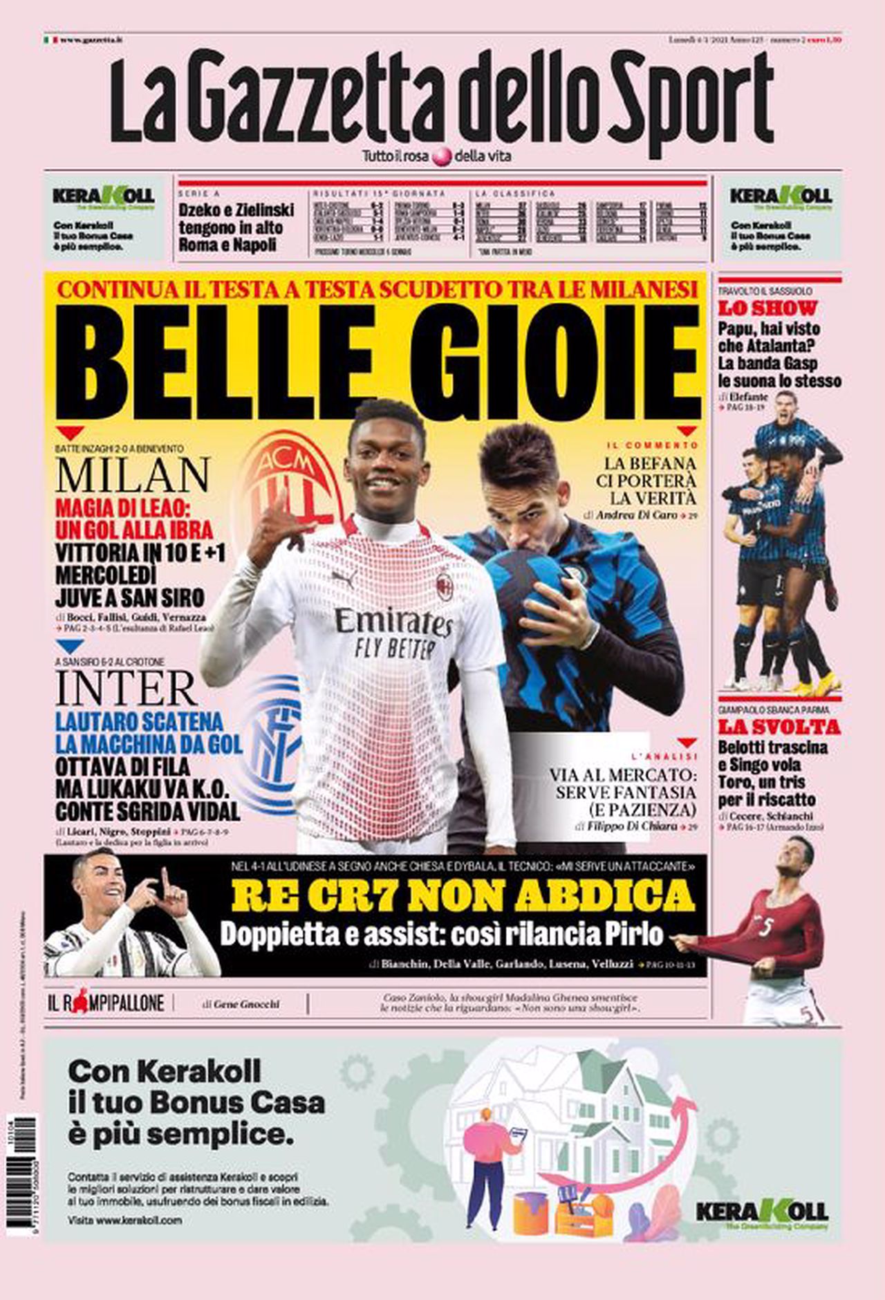 TORINO – La prima pagina de la Gazzetta dello Sport intitola così: “Belle gioie”. Il riferimento è alla vittoria delle due milanesi in questo turno di campionato che si confermano ai primi due posti in classifica. I nerazzurri hanno travolto il Crotone per 6-2 nel match di ieri alle 12.30 e si erano portati momentaneamente al primo posto, ma poi alle 18 il Milan ha battuto il Benevento 2-0 grazie ad un rigore di Calhanoglu e uno splendido gol di Leao ed ha riagguantato la vetta del campionato di Serie A. Nel posticipo la Juventus batte l’Udinese per 4-1 e guadagna punti in classifica sul Sassuolo che è stato sconfitto 5-1 dall’Atalanta. Una partita in cui i friulani meritavano sicuramente di più dopo il gol del vantaggio annullato a de Paul e dopo aver preso due traverse nel corso nella partita. Per i bianconeri sono andati a segno Cristiano Ronaldo (doppietta), Chiesa e Dybala, mentre per la squadra di Gotti è andato in gol Zeegelar.