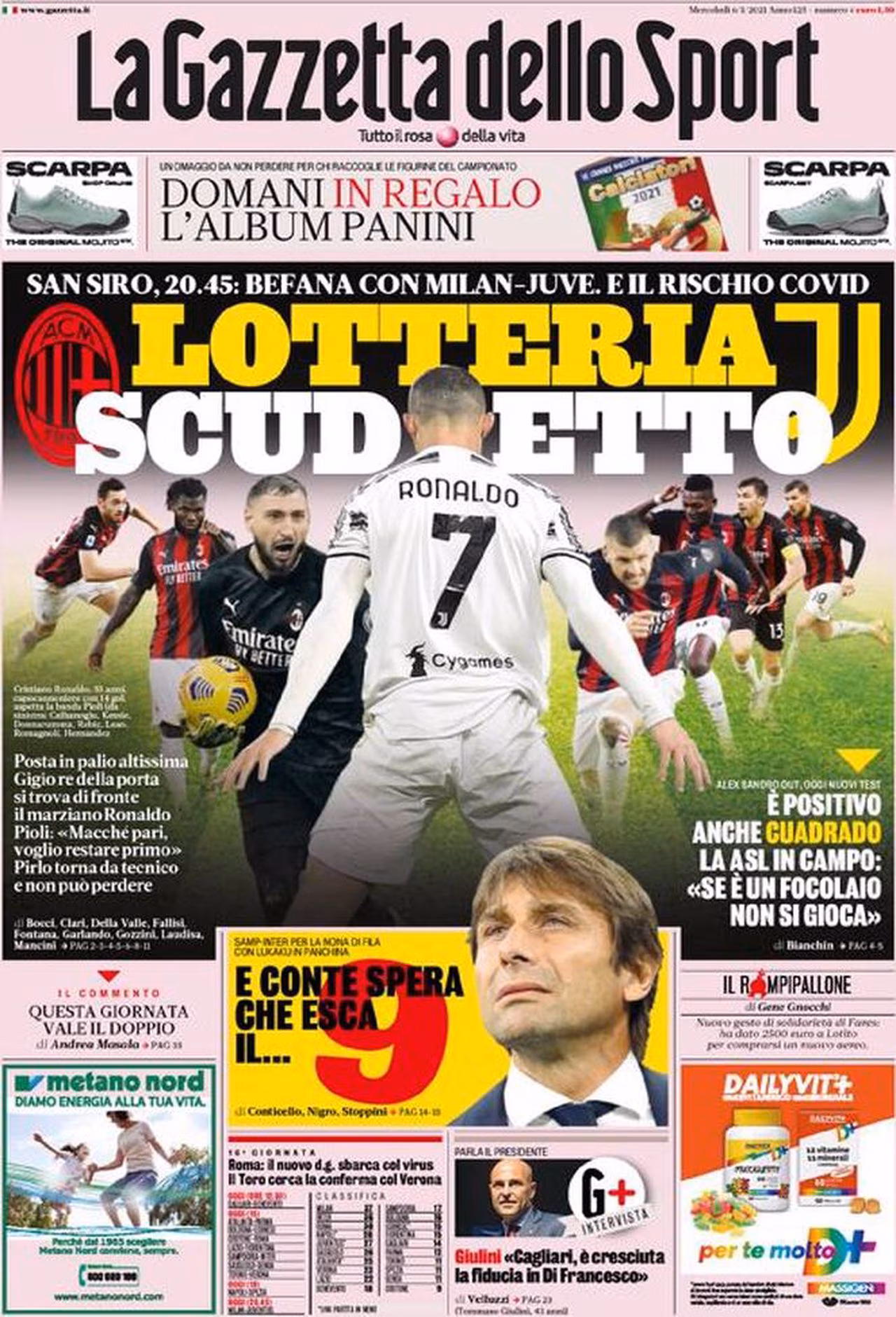 Ecco la prima pagina de La Gazzetta dello Sport. Il quotidiano milanese ha dedicato il titolo centrale alla super sfida di questa sera tra rossoneri e bianconeri, analizzando un po’ il match. “Lotteria Scudetto. San Siro, 20:45: Befana con Milan-Juve e il rischio Covid. Posta in palio altissima. Gigio re della porta si trova di fronte il marziano Ronaldo. Pioli: ‘Macché pari, voglio restare primo’. Pirlo torna da tecnico e non può perdere. É positivo anche Cuadrado. La ASL in campo: ‘Se è un focolaio non si gioca’“.