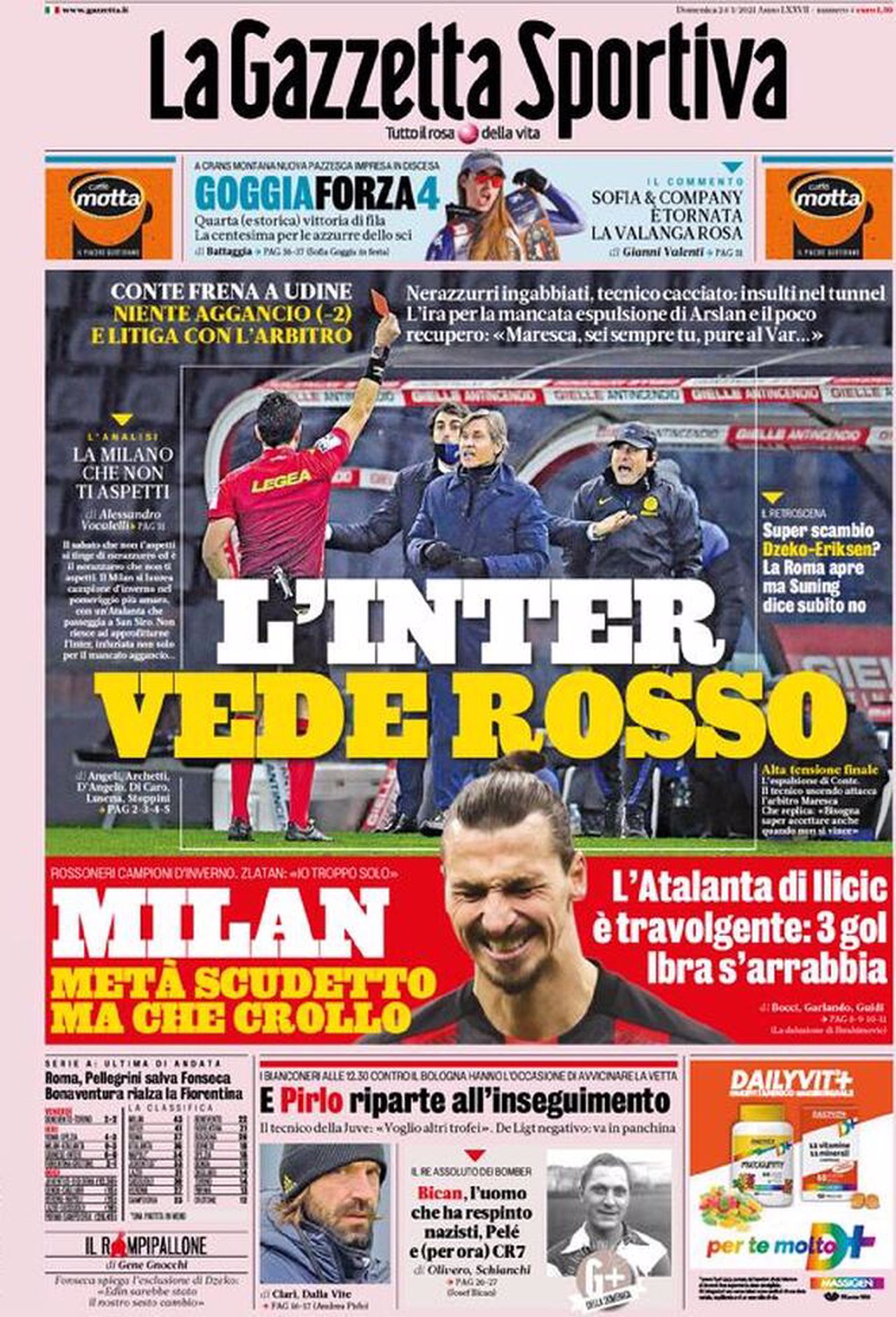 Ecco la prima pagina de La Gazzetta dello Sport. I titoli principali del quotidiano milanese sono riservati alla disfatta di Inter e Milan di ieri sera. “L’Inter vede rosso. Conte frena a Udine: niente aggancio (-2) e litiga con l’arbitro“. Sui rossoneri, invece: “Milan: metà Scudetto, ma che crollo. L’Atalanta di Ilicic è travolgente: 3 gol. Ibra s’arrabbia“. In fondo, dunque, lo spazio dedicato alla Juventus, che potrebbe tentare di guadagnare terreno sulle due concorrenti. “E Pirlo parte all’inseguimento. I bianconeri alle 12:30 contro il Bologna hanno l’occasione di riavvicinare la vetta. Il tecnico della Juve: ‘Voglio altri trofei’. De Ligt negativo: va in panchina“.